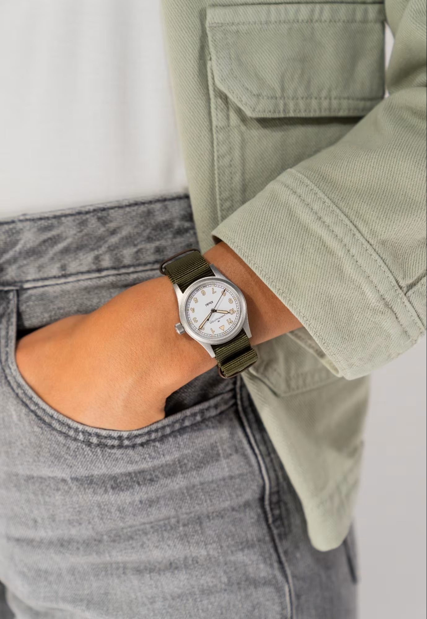Il Khaki Field Quartz esprime la tradizione militare Hamilton tramite la semplicità del design. Sul quadrante spicca un font chiaro con numeri arabi ben dritti e una minuteria a binario. La palette cromatica è sobria: un quadrante bianco raffinato messo in risalto da indici in Super-LumiNova® color rodio anticato. Perfetto per le tue avventure all'aria aperta, l'orologio è provvisto di un cinturino verde in tessuto NATO con passanti in pelle marrone.