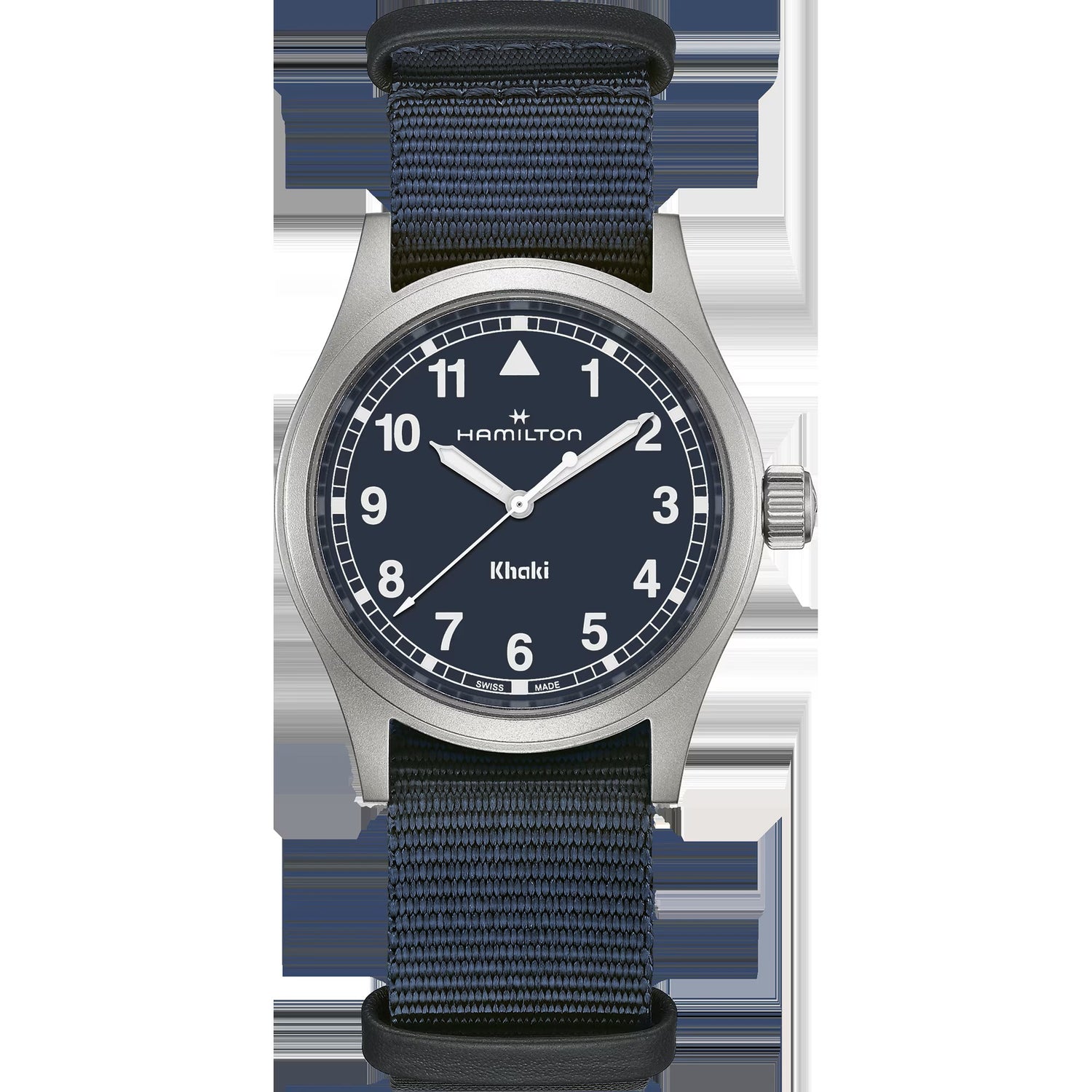 Il Khaki Field Quartz incarna la tradizione militare Hamilton tramite la semplicità del suo design. Sul quadrante spicca un font chiaro con numeri arabi ben dritti e una minuteria a binario. La palette cromatica è sobria: un quadrante blu raffinato messo in risalto da indici in Super-LumiNova® bianco. Perfetto per le tue avventure all'aria aperta, l'orologio è provvisto di un cinturino blu in tessuto NATO con passanti in pelle blu.