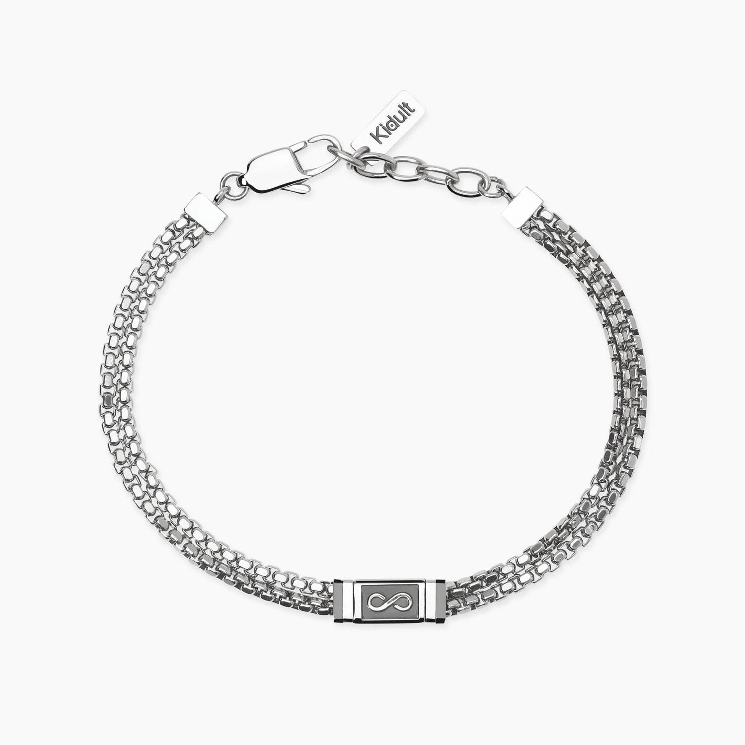 Bracciale regolabile in acciaio con catene venete ed elemento centrale con simbolo infinito lucido e in PVD nero.