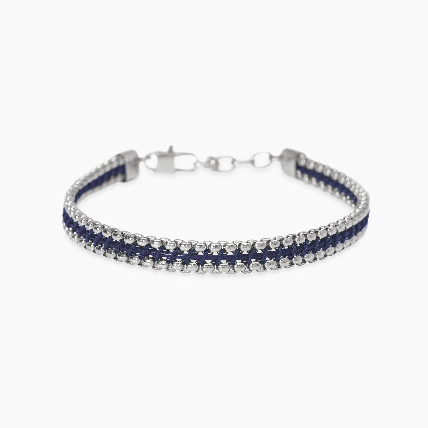 Bacciale regolabile con catene veneziane in acciaio, nylon blu e pelle interna.