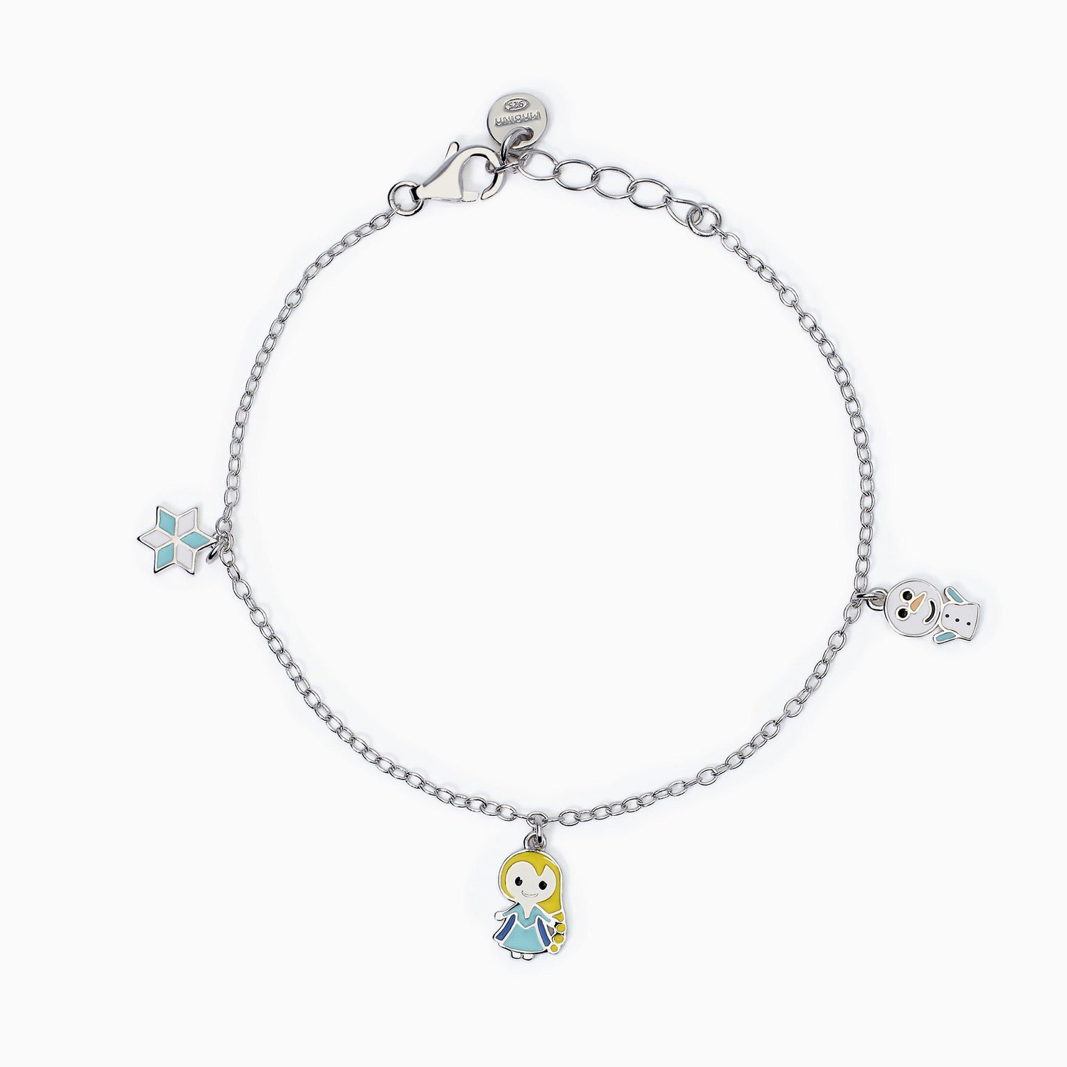 Bracciale regolabile da bambina in argento rodiato con catena forzatina e ciondoli smaltati a forma di fiocco di neve, bambina e pupazzo di neve.