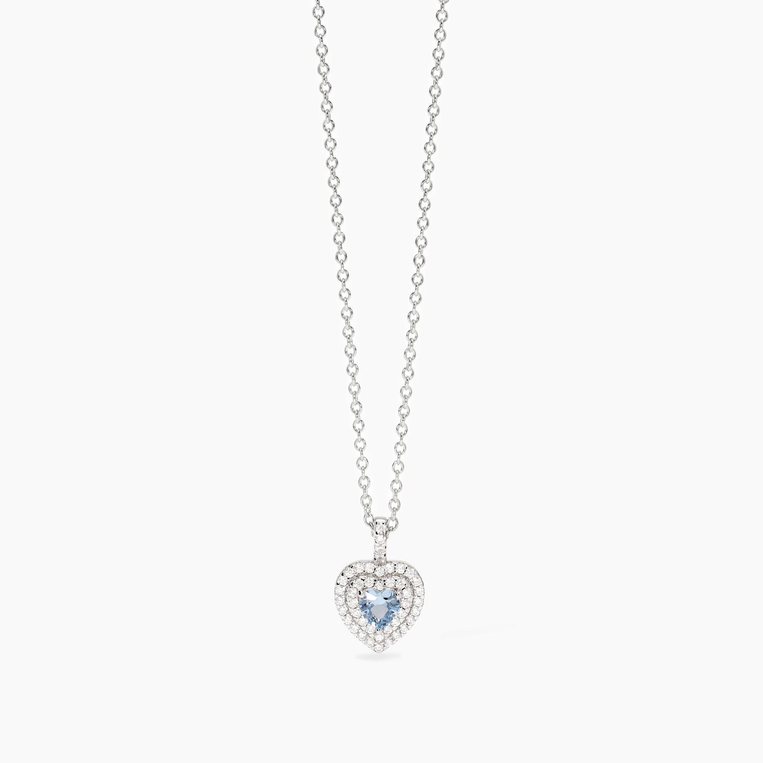 Girocollo in argento rodiato con catena rolò e acquamarina sintetica taglio cuore con zirconi.