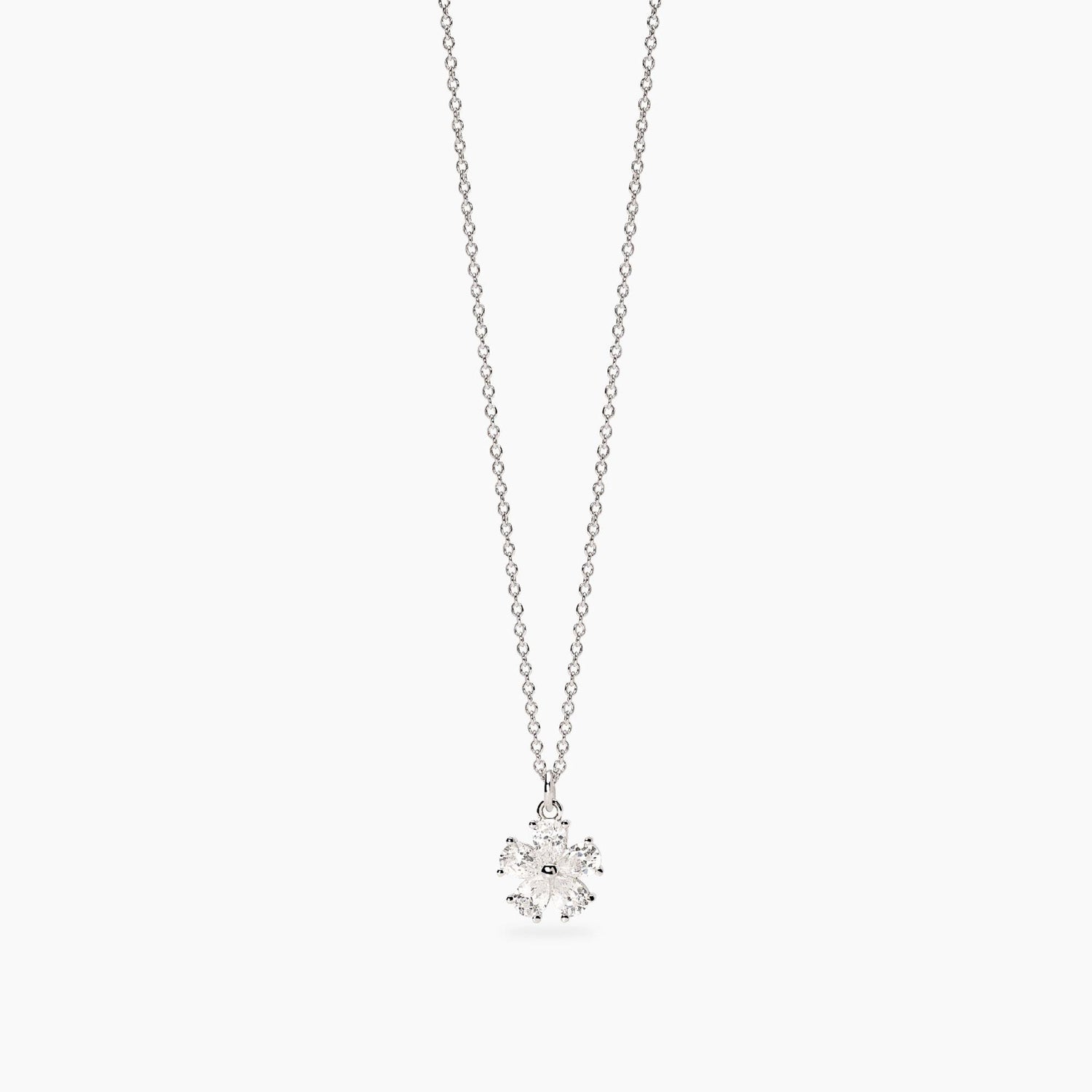 Girocollo regolabile in argento rodiato con catena rolò e pendente fiore in zirconi taglio goccia.