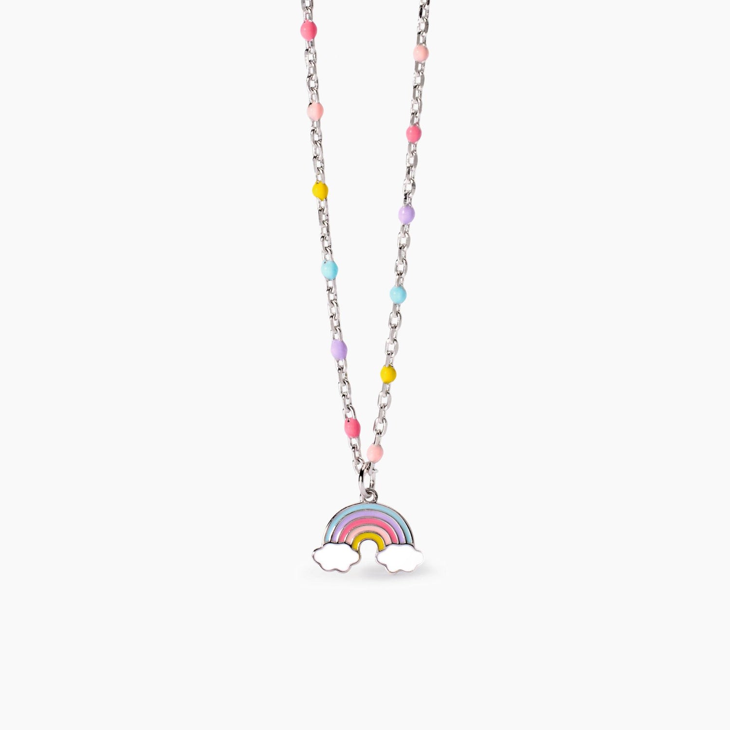 Girocollo regolabile da bambina in argento rodiato con applicazioni smaltate, catena forzatina e pendente smaltato a forma di arcobaleno.