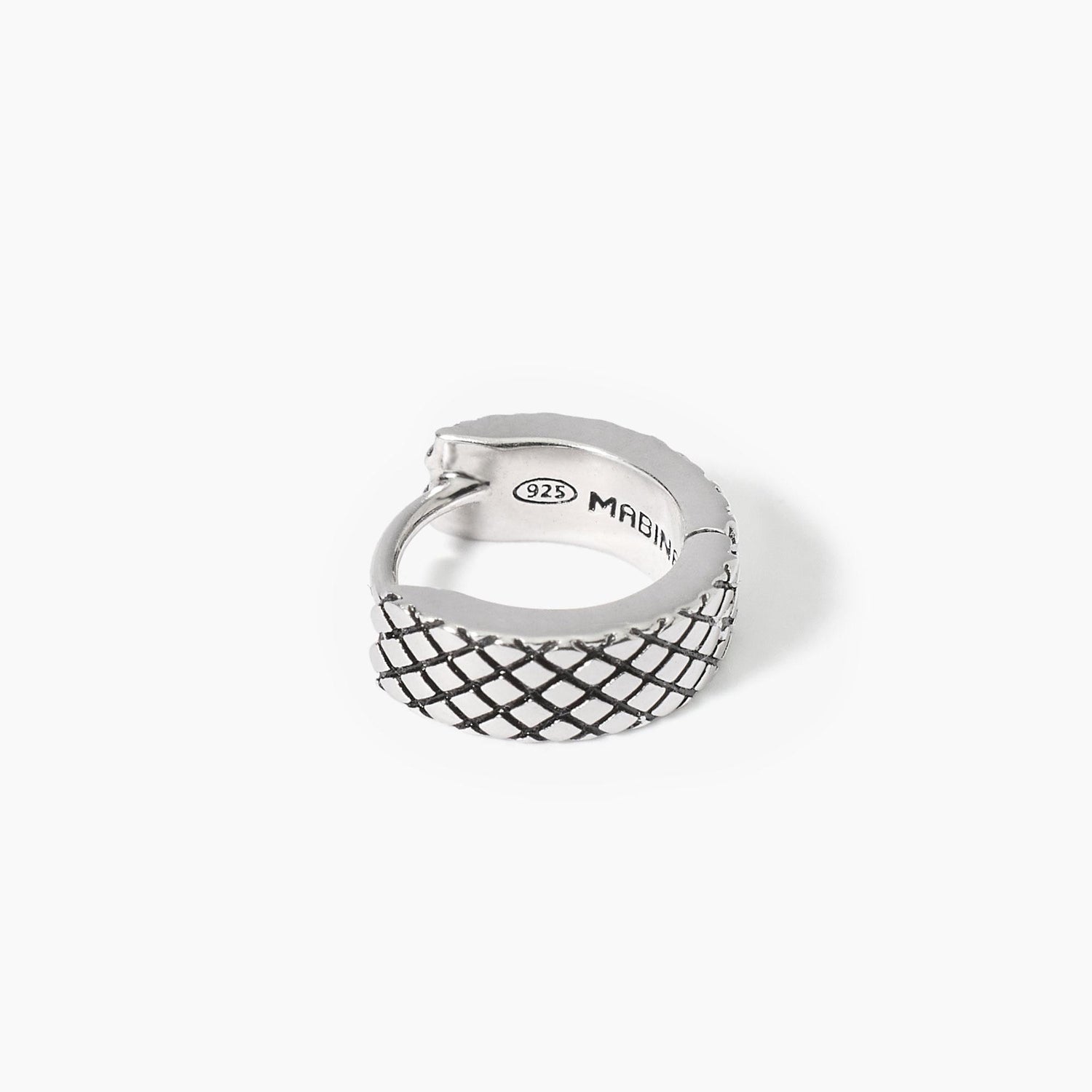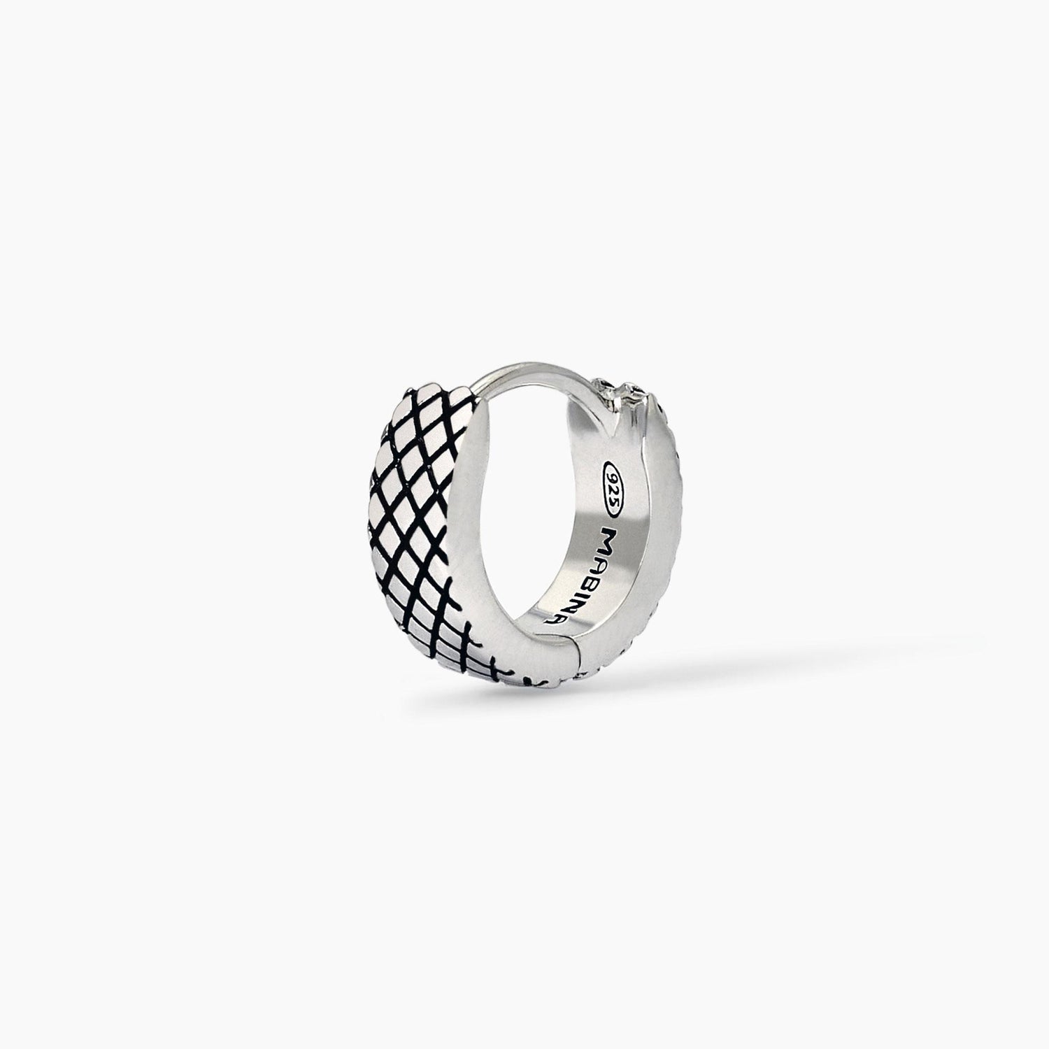 Orecchino da uomo a cerchio in argento rodiato con finitura a rombi.