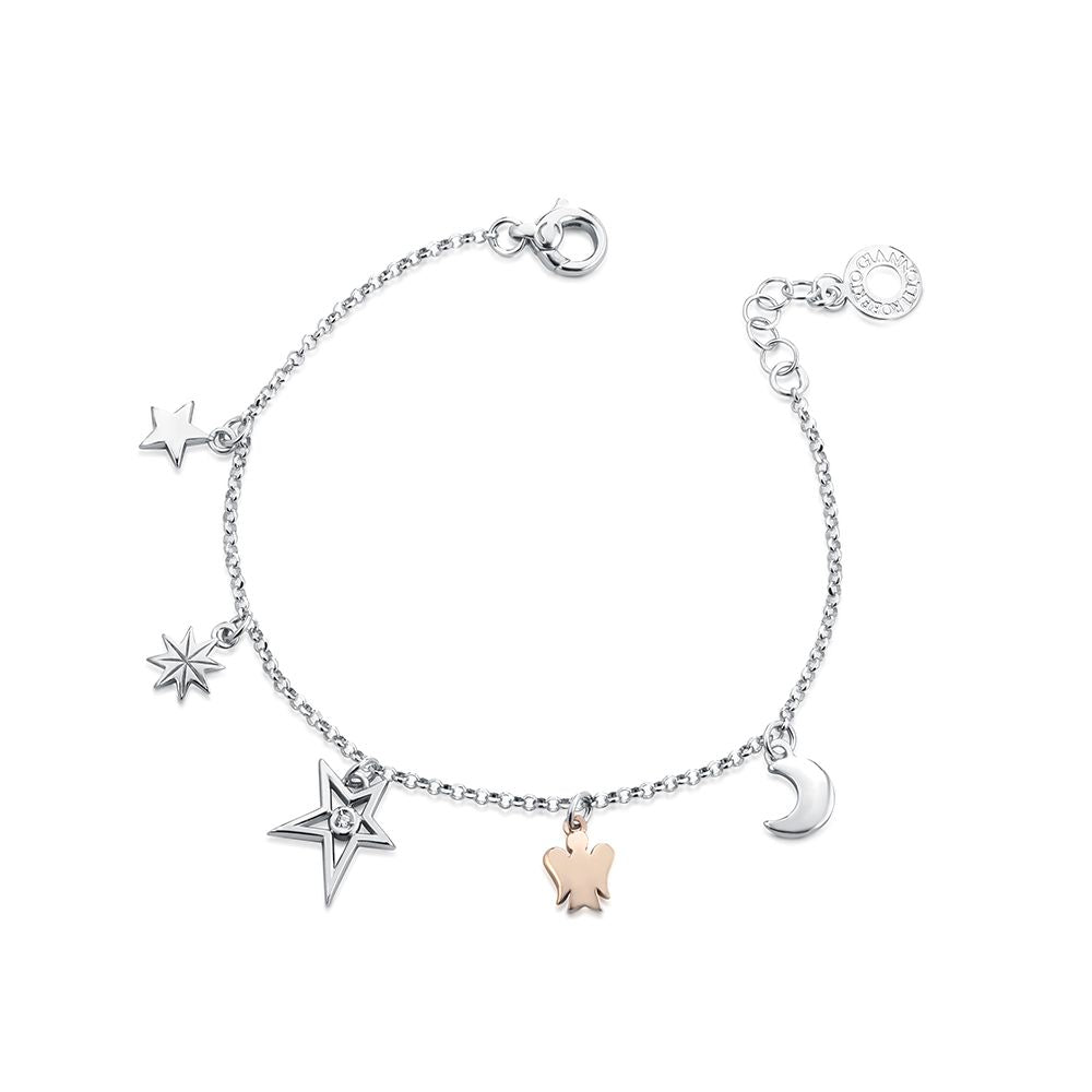 Bracelet with stars and moon charm in silver, Angel charm in rosy silver and diamond.