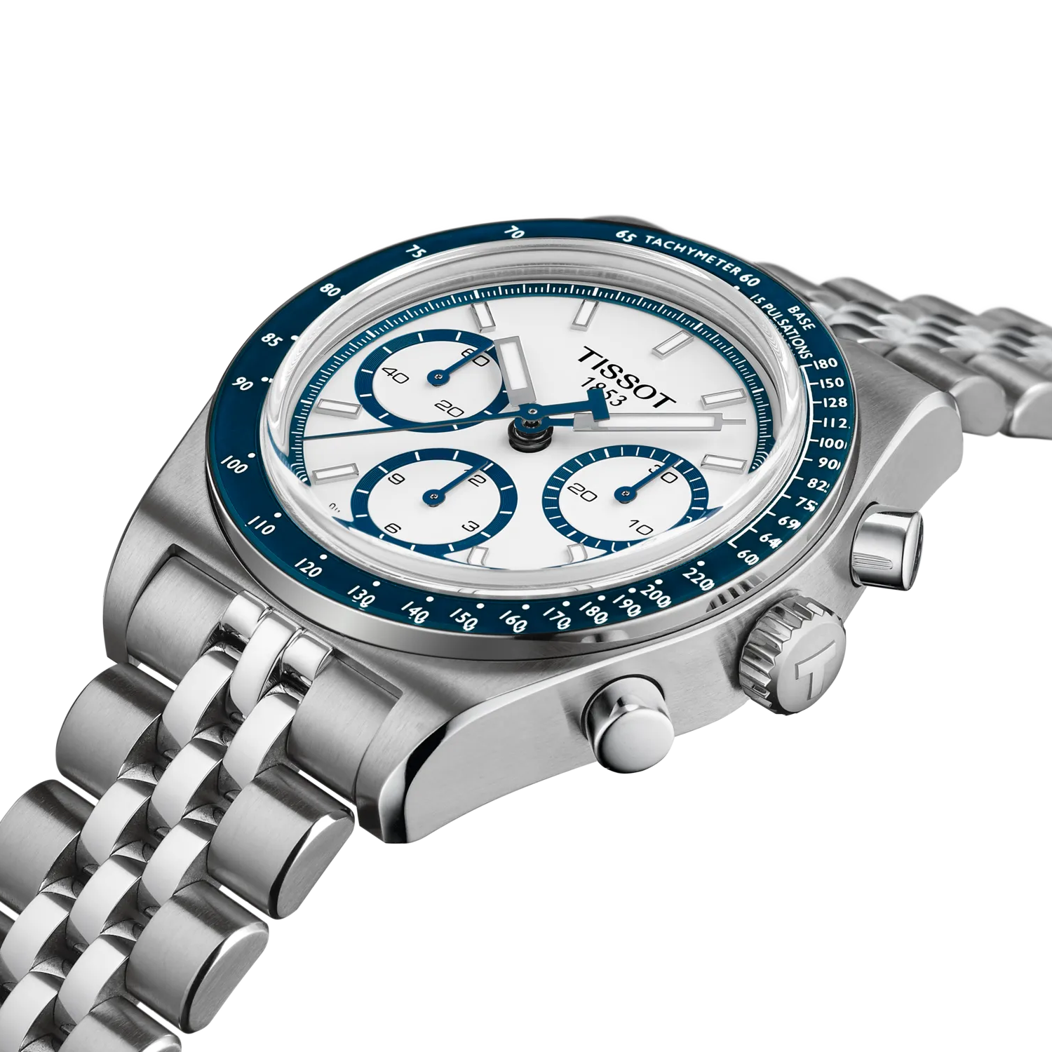 Presentato per la prima volta negli anni '60, il PR516 è stato ispirato dal mondo ad alta velocità delle corse automobilistiche. Mentre Tissot espande la linea PR516, continua ad alimentare lo spirito di coloro che cercano un orologio implacabile come le loro attività, spingendoli ad affrontare le sfide a testa alta, proprio come gli eroi che lo indossano. Il cronografo, il tachimetro e il pulsometro Valjoux lavorano all'unisono e sono costruiti per catturare ogni battito quando la vita sembra esaltante. Con velocità e frequenza cardiaca monitorate sulla lunetta e il tempo chiaramente visualizzato sul quadrante bianco con accenti blu, questo design offre un'esperienza fluida e intuitiva, evocando il cielo sconfinato e il potenziale sconfinato che ci attende. I contatori, posizionati nella parte inferiore del quadrante, esaltano l'aspetto dinamico dell'orologio.