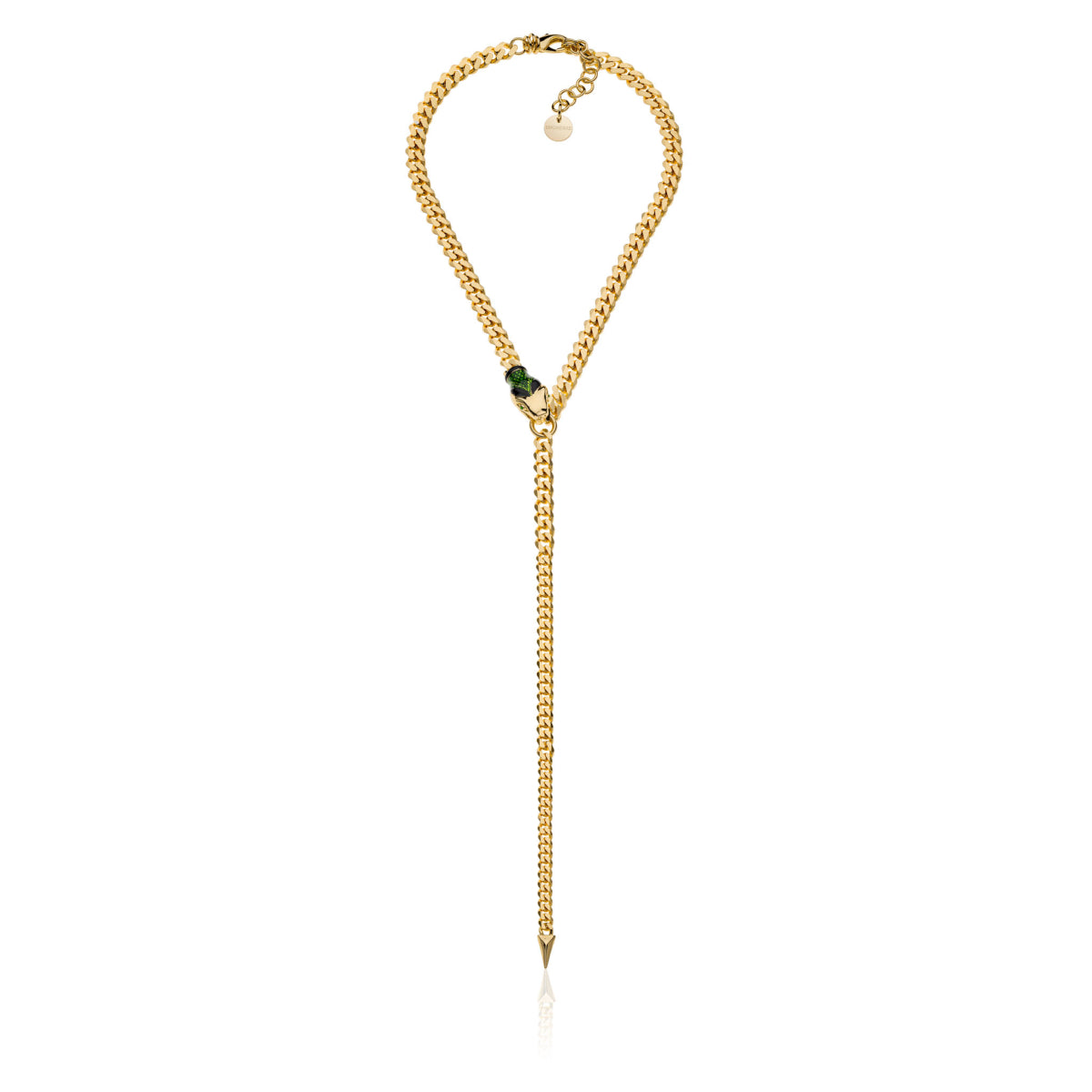 Collier di catena grumetta battuta in bronzo dorato con testa di serpente e finitura in smalto verde. Forme sinuose, movimento e volume irresistibile per una collana dal design unico ed ipnotico. Un gioiello luminoso e d'impatto che da solo costruisce un look e racconta un desiderio ardente.
