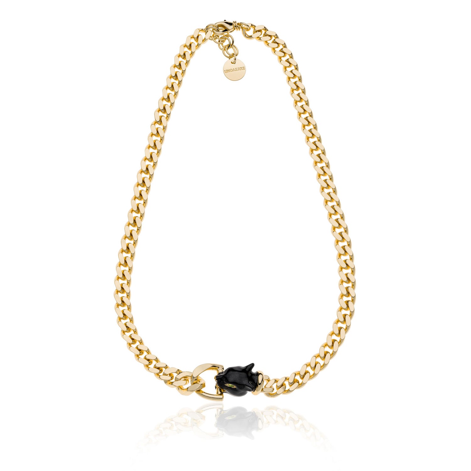 Collana in catena grumetta diamantata con centrale a testa di pantera e smalto nero. Misura 41,50 cm. L'iconico tema animalier affascina e sorprende in questa collana dal design importante e grintoso. Completa il look con anello e bracciale coordinati per un outfit dalla sensualità audace e selvaggia.