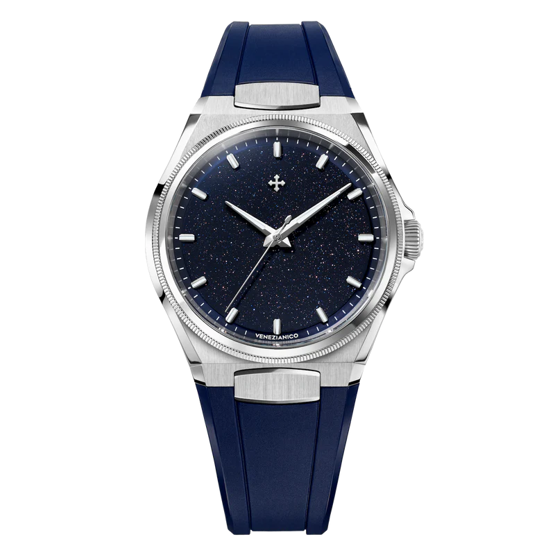 L’Avventurina, utilizzata in questo modello di Arsenale, è un materiale vetroso pregiato scoperto a Venezia nel XVII secolo dai maestri di Murano. È conosciuta per il suo caratteristico scintillio, simile a un cielo stellato, ottenuto aggiungendo piccoli frammenti di rame durante la lavorazione. Un dettaglio che rende unico ogni quadrante, ispirato alla tradizione veneziana.