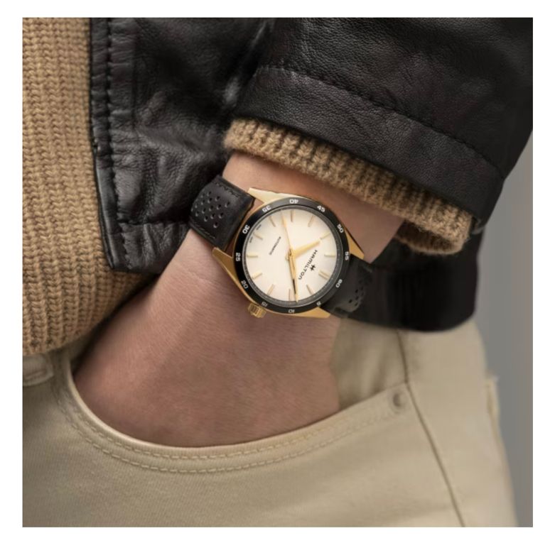Pensata per chi ama l’equilibrio tra stile e funzionalità, la linea Jazzmaster Performer offre un look sporty-chic accattivante. Animato dal movimento automatico H-10 con riserva di carica fino a 80 ore, questo Jazzmaster Performer Automatic presenta una cassa in acciaio da 38 mm con rivestimento in PVD oro rosa, messa in risalto da un sobrio quadrante bianco e un cinturino in pelle nera traforata abbinato alla lunetta e ispirato alle corse automobilistiche.
