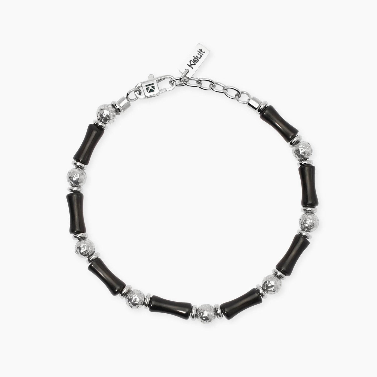 Bracciale regolabile in acciaio con sfere martellate ed elementi in ossidiana.