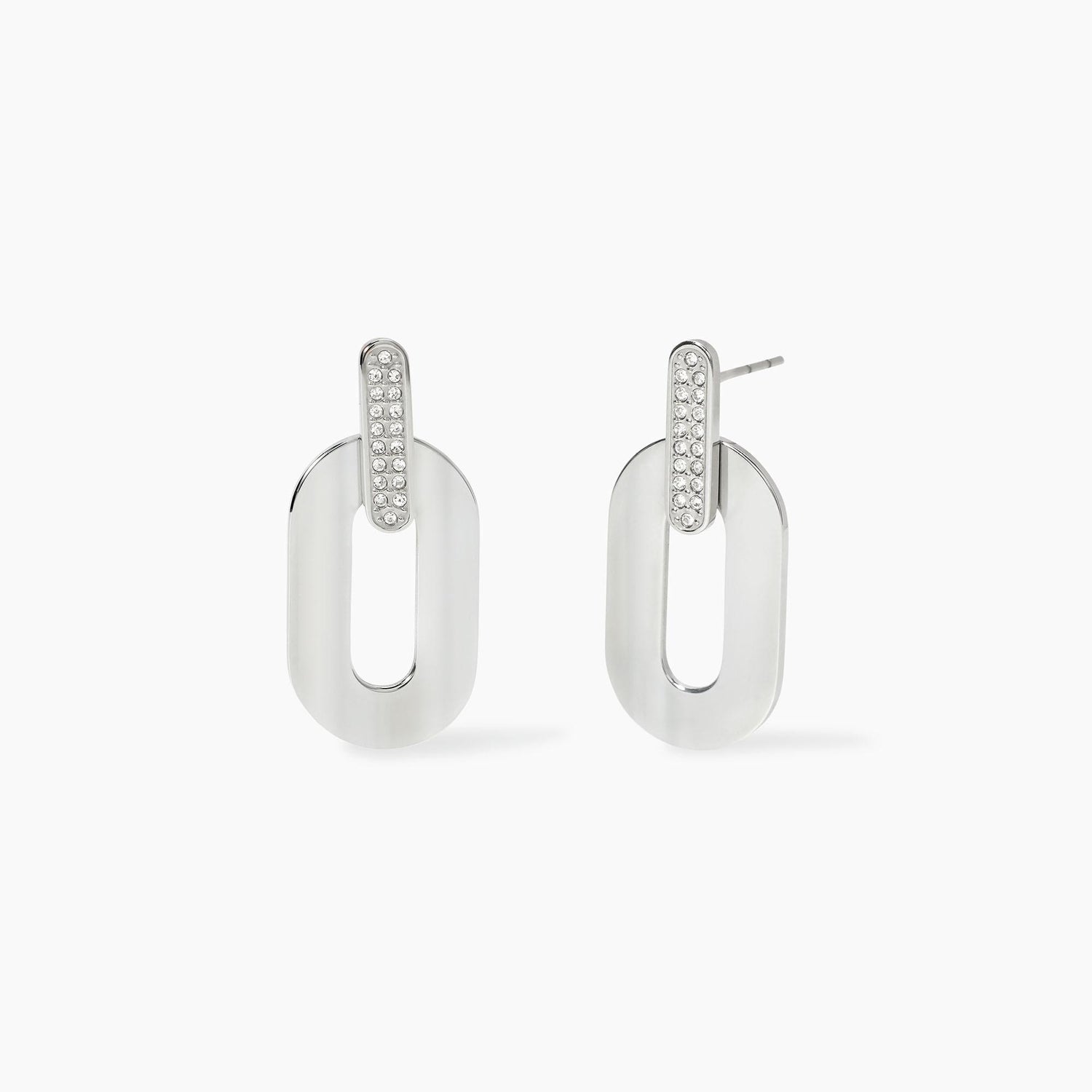Orecchini in acciaio con cristalli e pendenti allungati.