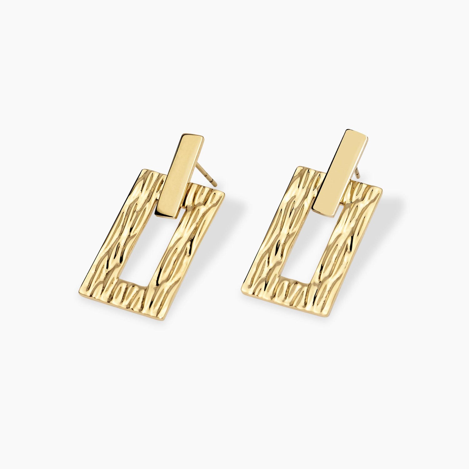 Orecchini in acciaio dorato con pendenti rettangolari martellati.