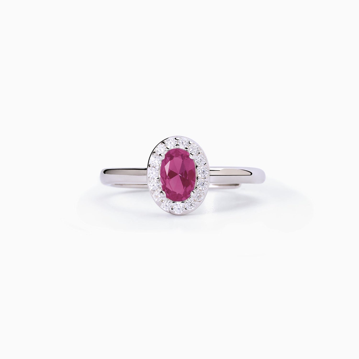 Anello da donna in argento rodiato con smeraldo sintetico o rubino sintetico ovale e zirconi bianchi.