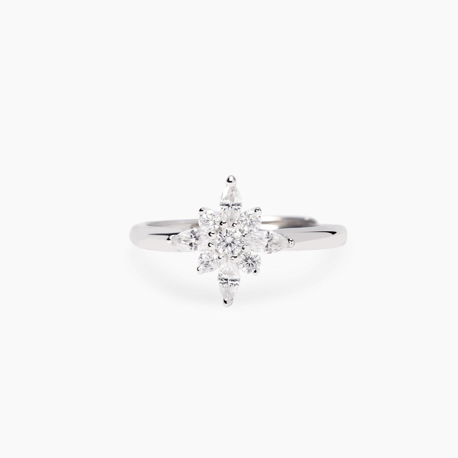 Anello regolabile in argento rodiato con stella polare in zirconi bianchi.