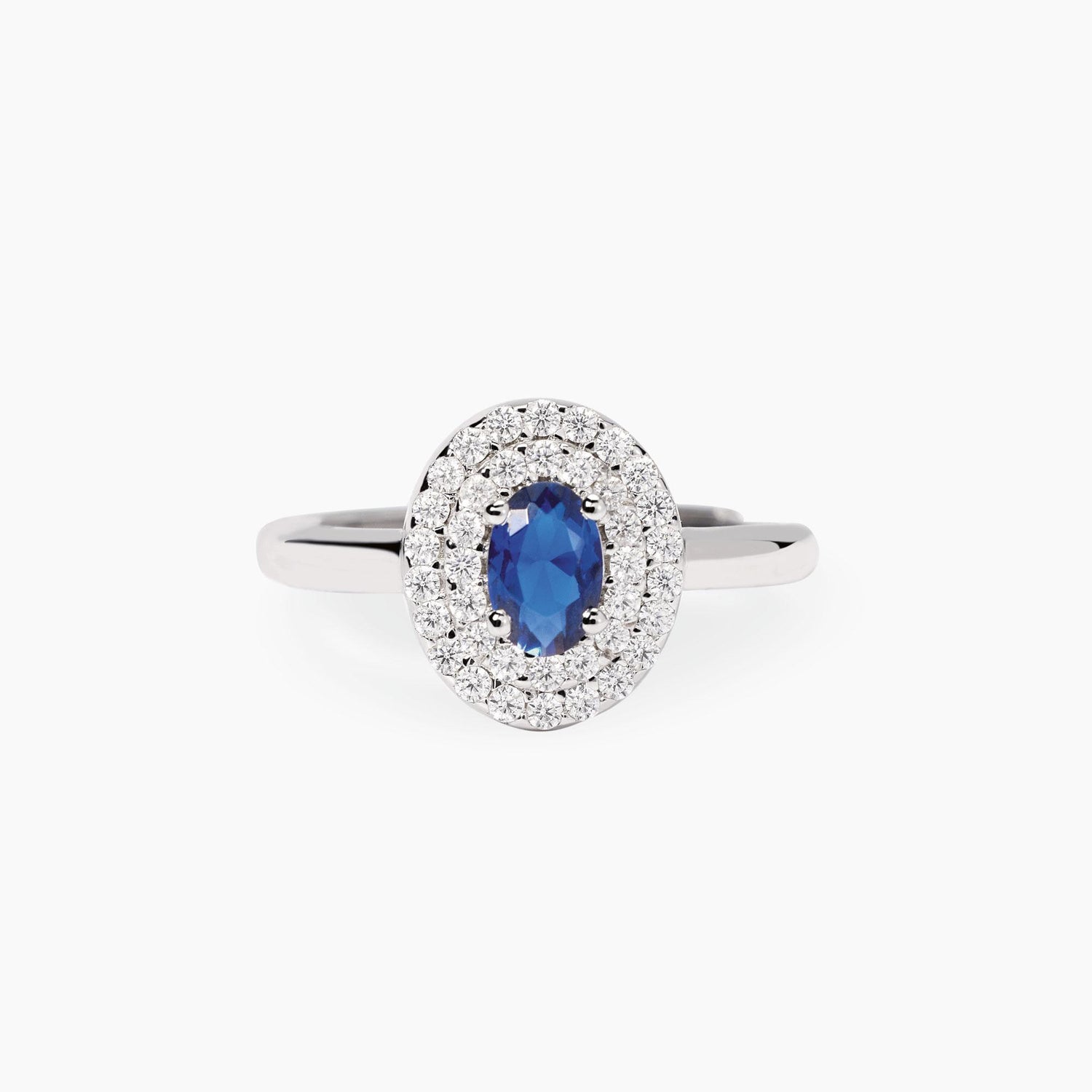 Anello regolabile in argento rodiato con zaffiro sintetico taglio ovale e zirconi bianchi.