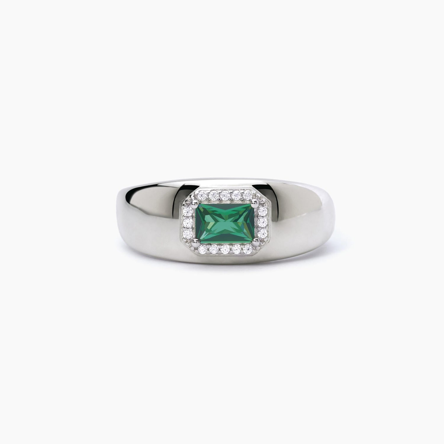 Anello in argento a fascia con incastonato uno smeraldo sintetico taglio baguette circondato da zirconi bianchi.
