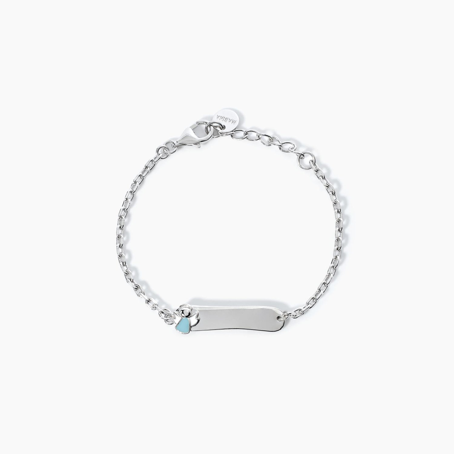 Bracciale neonato in argento con angelo smaltato azzurro e catena rolò con gocce in smalto multicolor. Il bracciale presenta una targhetta centrale sulla quale è possibile incidere date, iniziali o nomi.