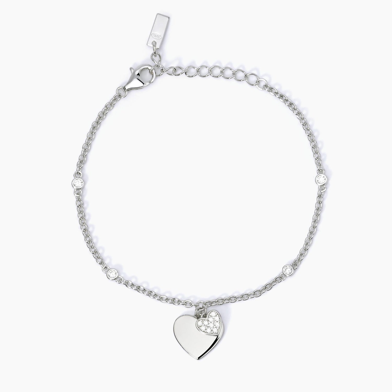 Bracciale in argento con catena forzatina con ciondoli sovrapposti a forma di cuore. Il ciondolo principale può essere personalizzato attraverso l'incisione di date, iniziali o nomi mentre il cuore pavè conferisce lumonisità al gioiello.