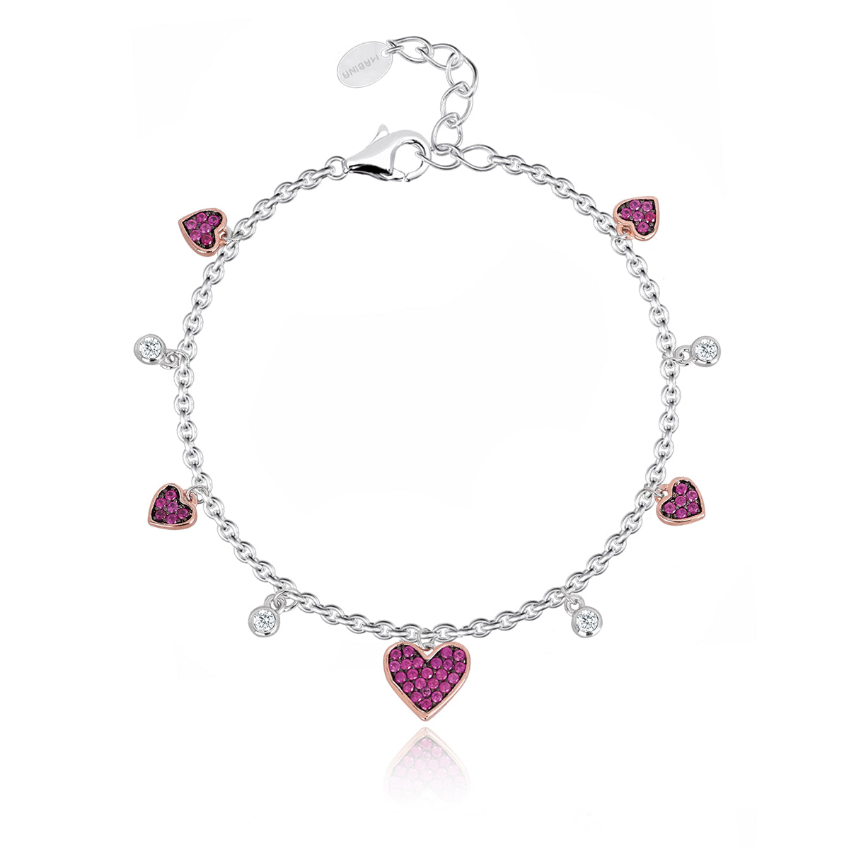 Bracciale in argento bicolore con cuori rosati in pavé di rubini sintetici alternati a punti luce in zircone.