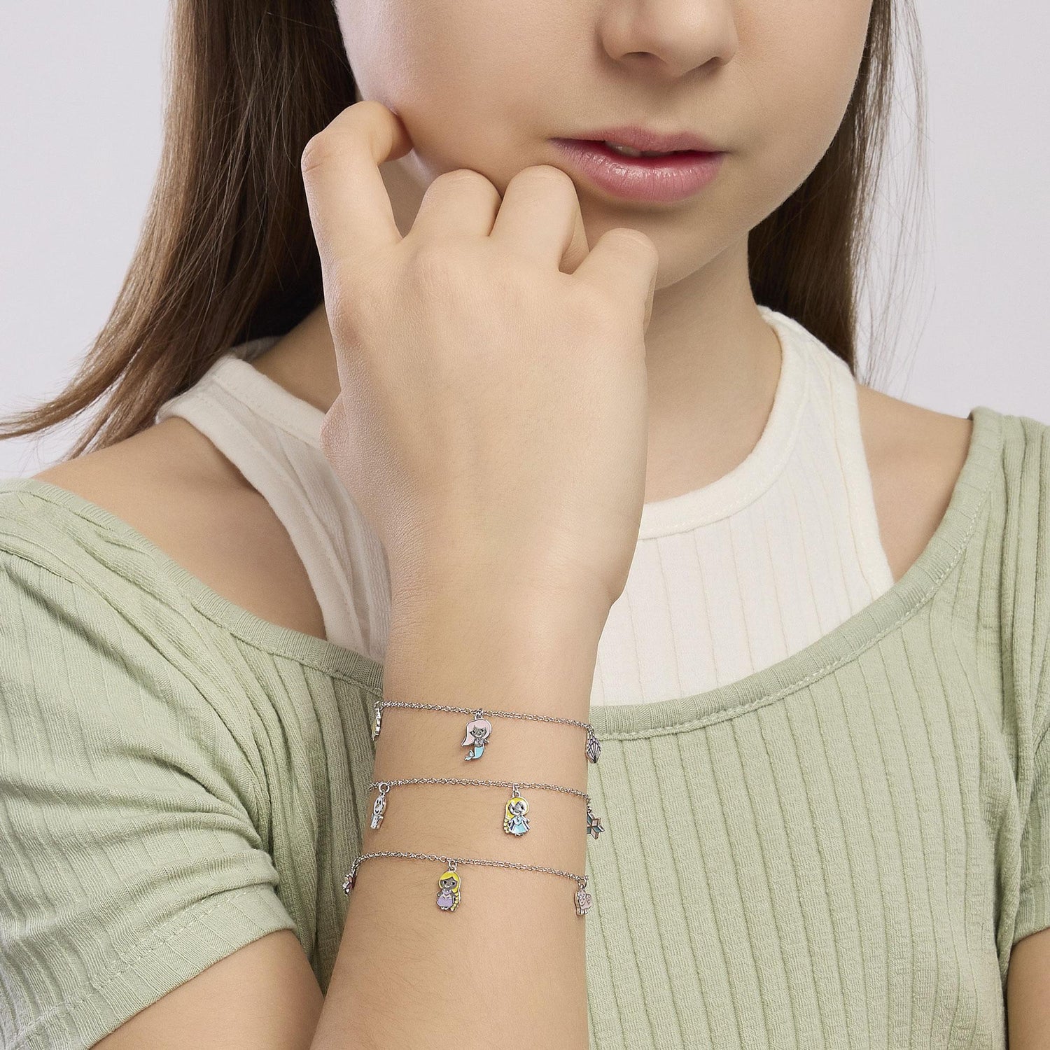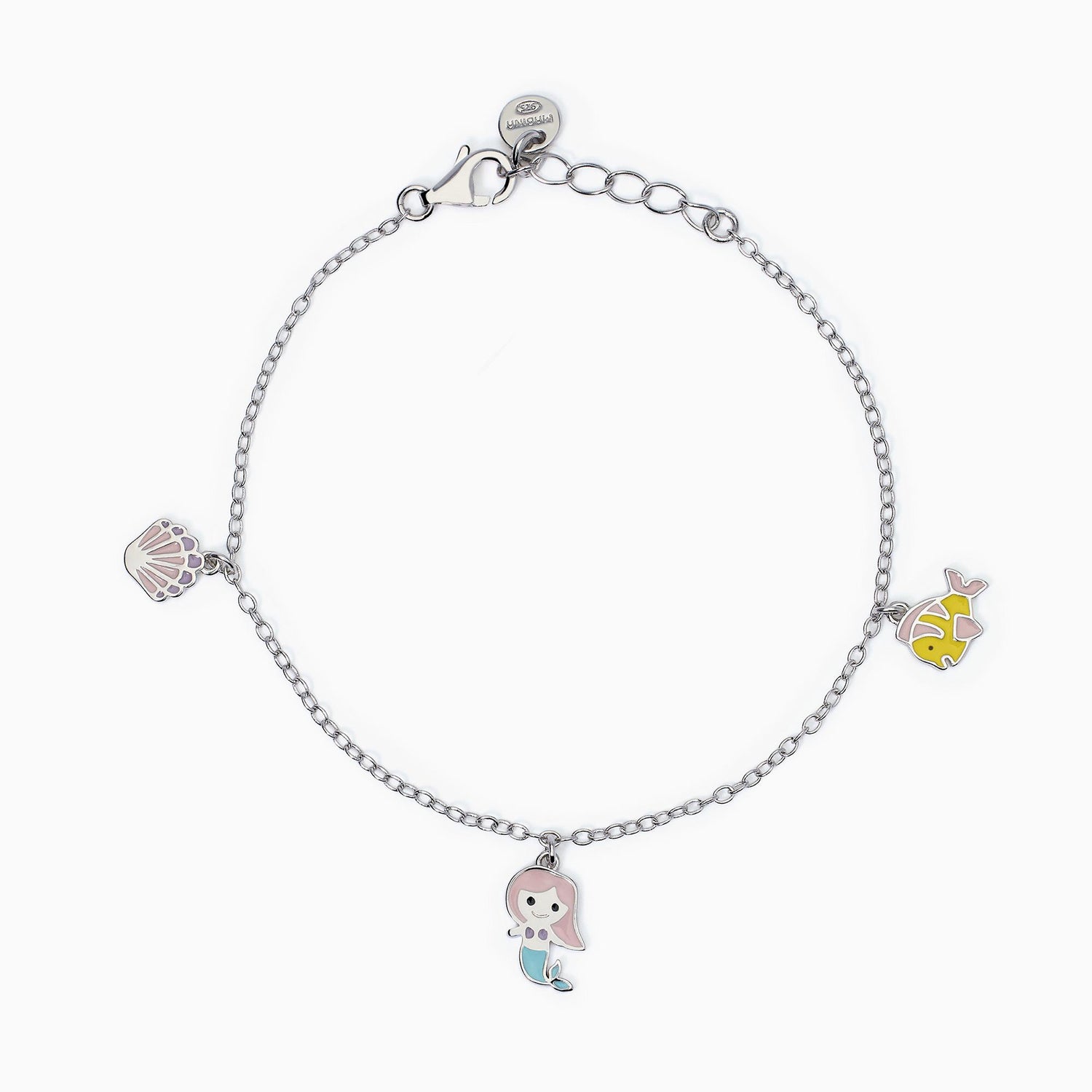 Bracciale regolabile in argento rodiato con catena forzatina e ciondoli smaltati a forma di conchiglia, sirenetta e pesciolino.