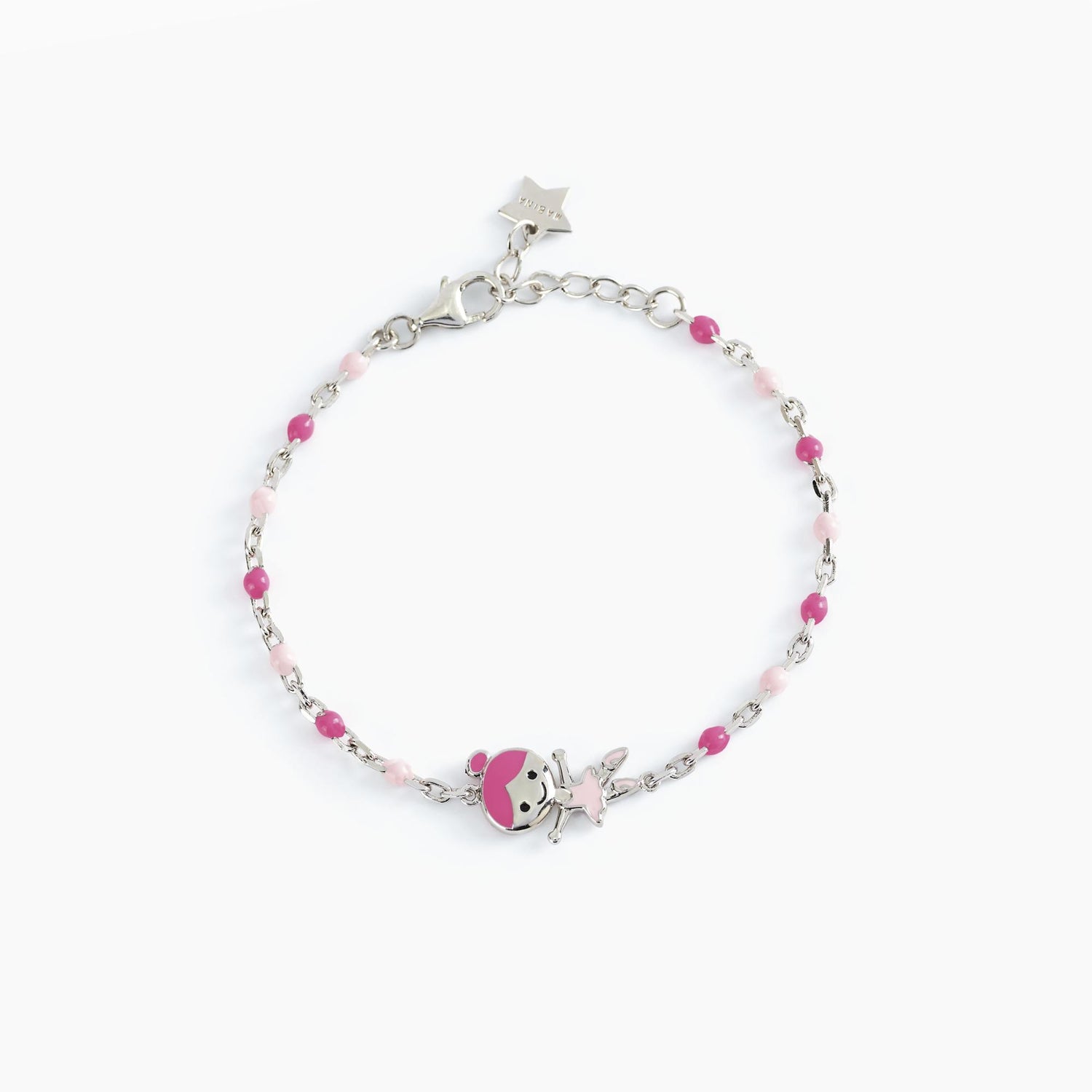 Bracciale in argento con ciondolo a forma di ballerina smaltata e catena rolò con gocce in smalto rosa in due tonalità.