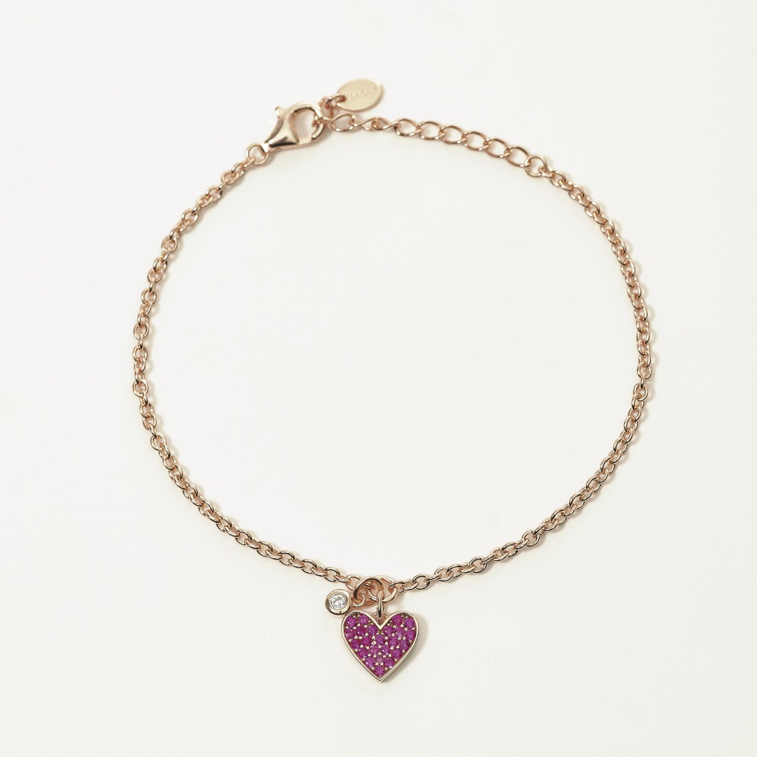 Bracciale rolò in argento rosato con ciondolo a cuore in pavé di rubini sintetici e zircone.