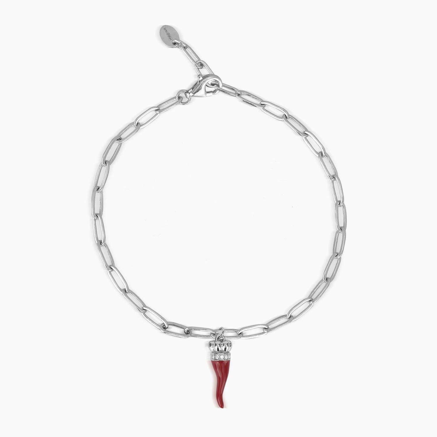 Bracciale maglie ovali in argento con ciondolo a forma di cornetto smaltato con zirconi.