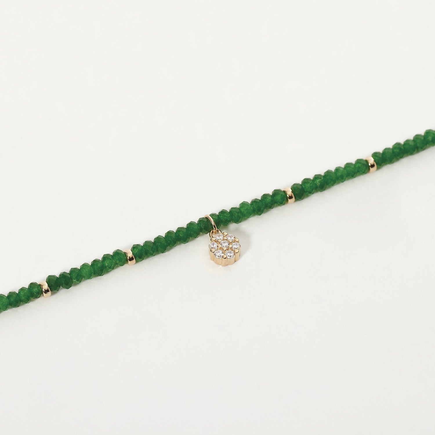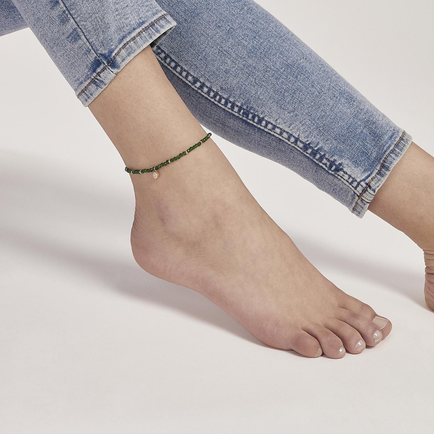 Bracciale da caviglia in argento 925/°°° dorato, lunghezza regolabile da 21.50 a 25.50 cm con giada verde Ø 3 mm e ciondolo con zirconi bianchi Ø 1.75 mm.