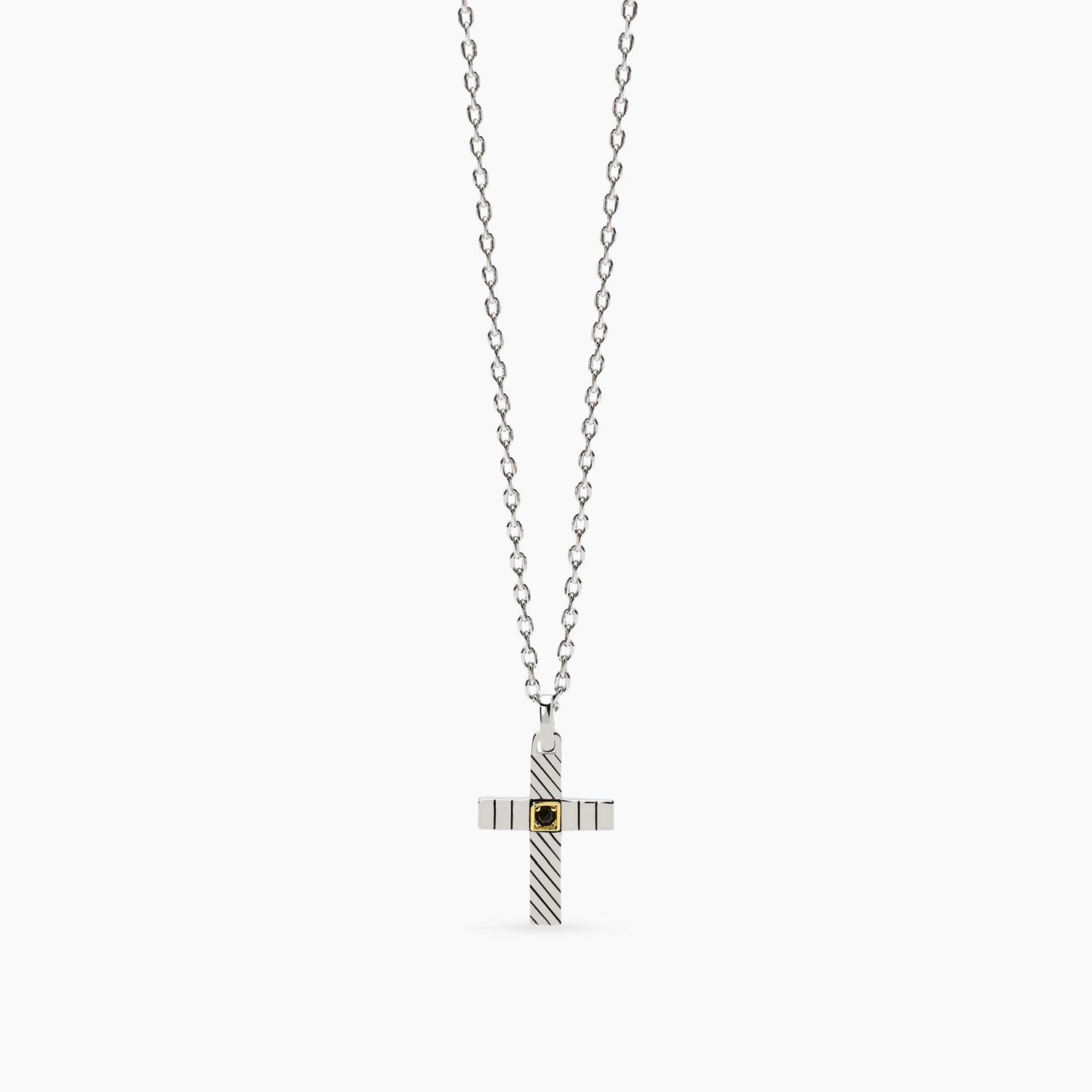 Collana con catena forzatina in argento rodiato e croce lucida con placcatura oro 18K e zircone nero.