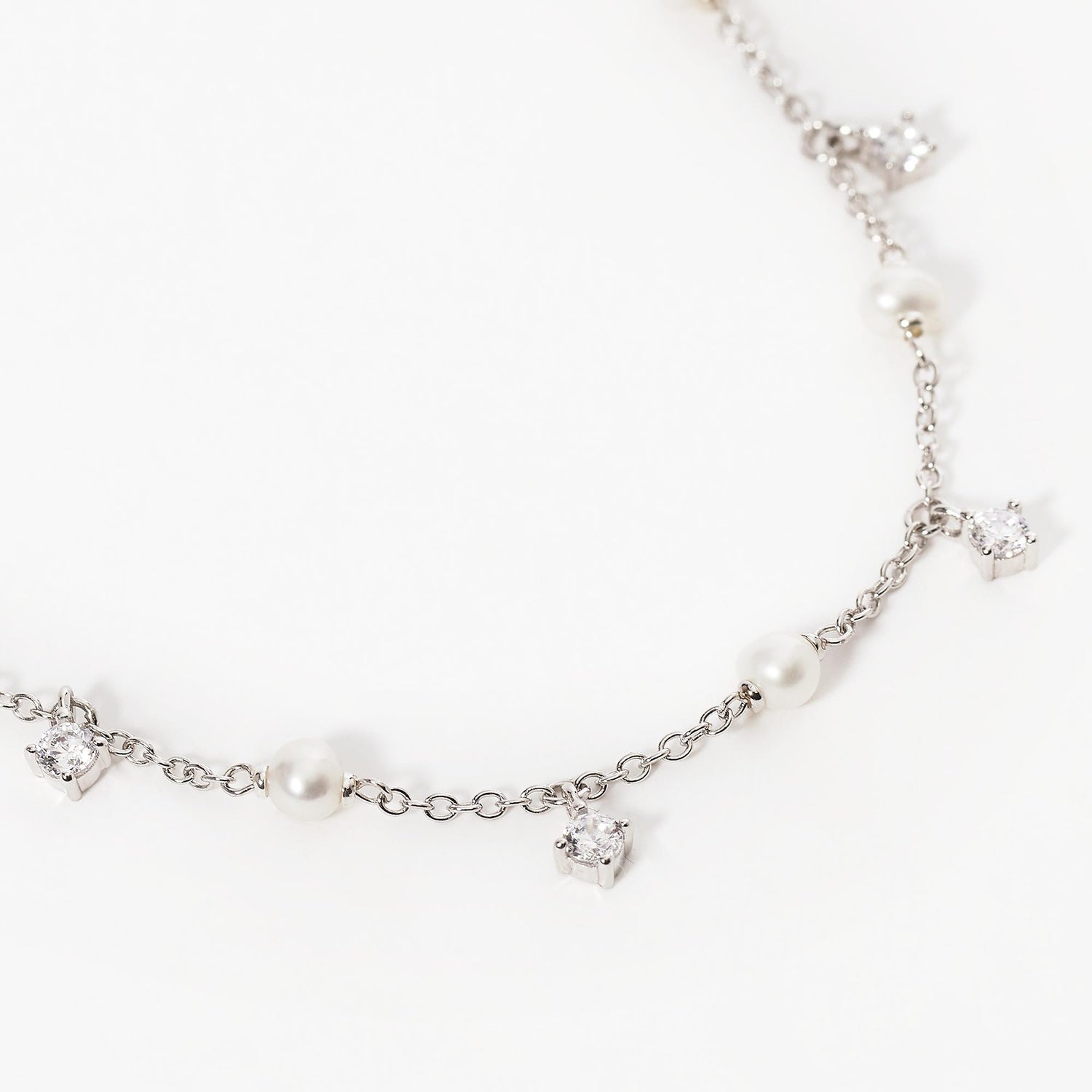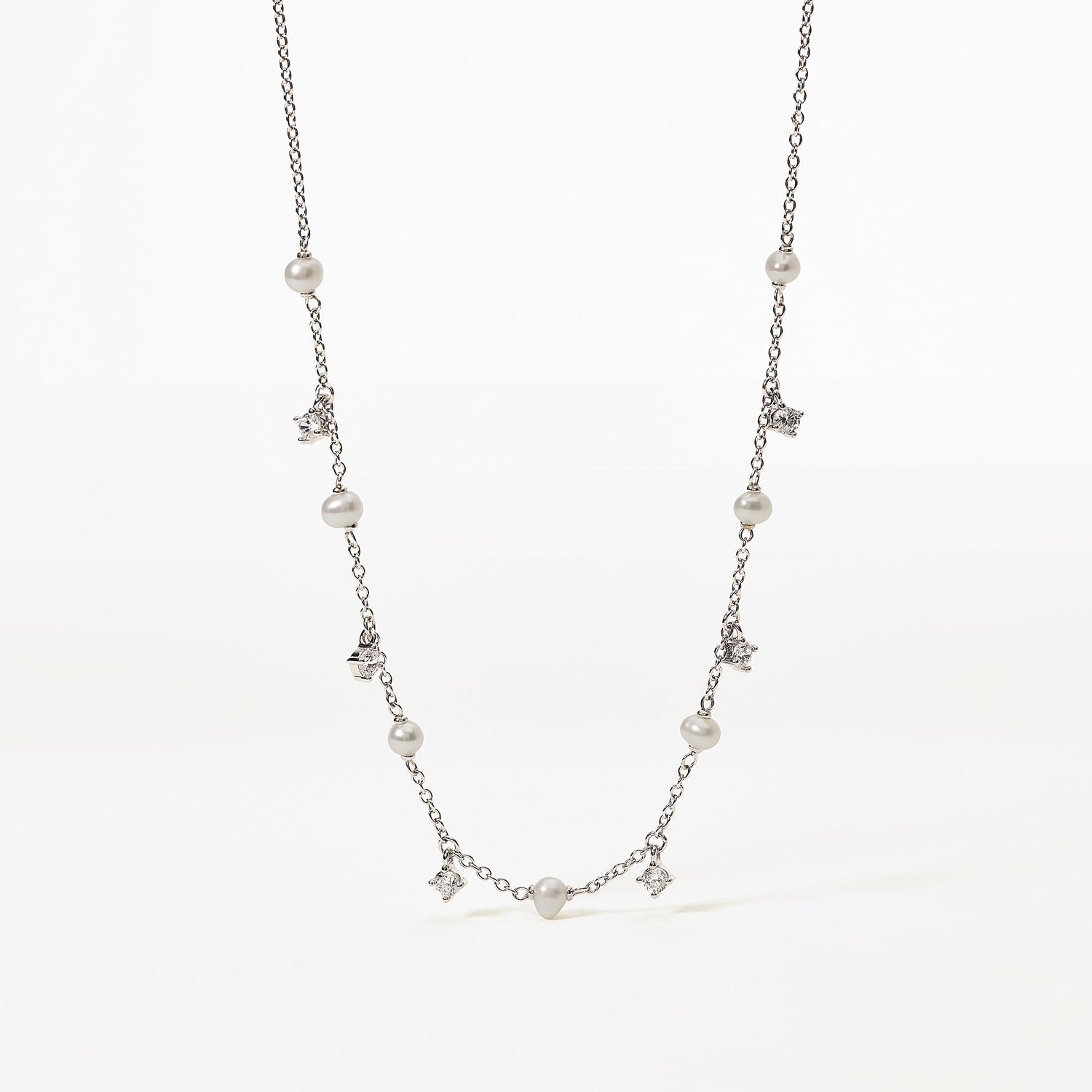 Girocollo in argento 925/°°° catena rolò larghezza 1.50 mm, lunghezza regolabile da 36 a 40 cm con perle coltivate Ø 3 - 4 mm e zirconi bianchi Ø 3 mm.