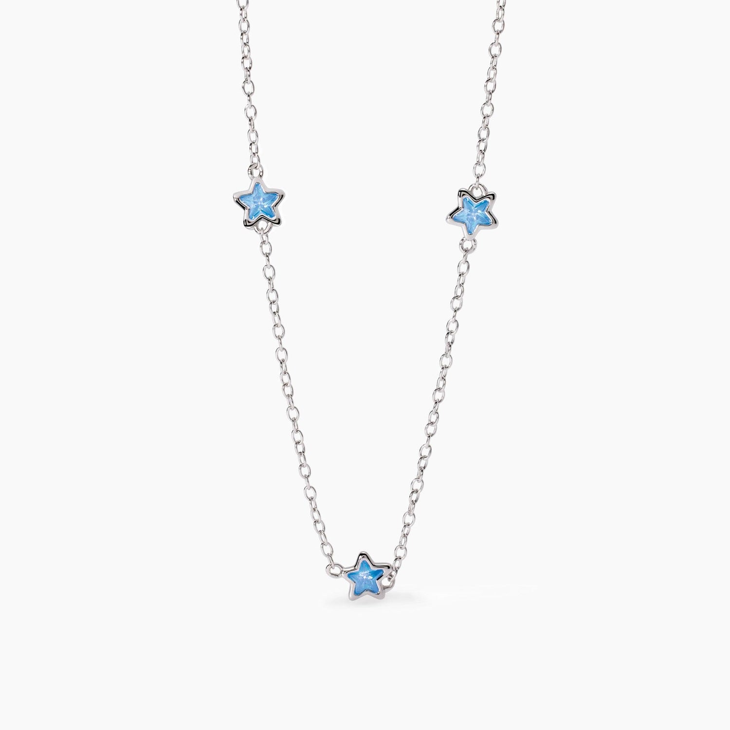 Girocollo regolabile da bambina in argento rodiato con catena rolò e zirconi azzurri sfaccettati a forma di stellina.