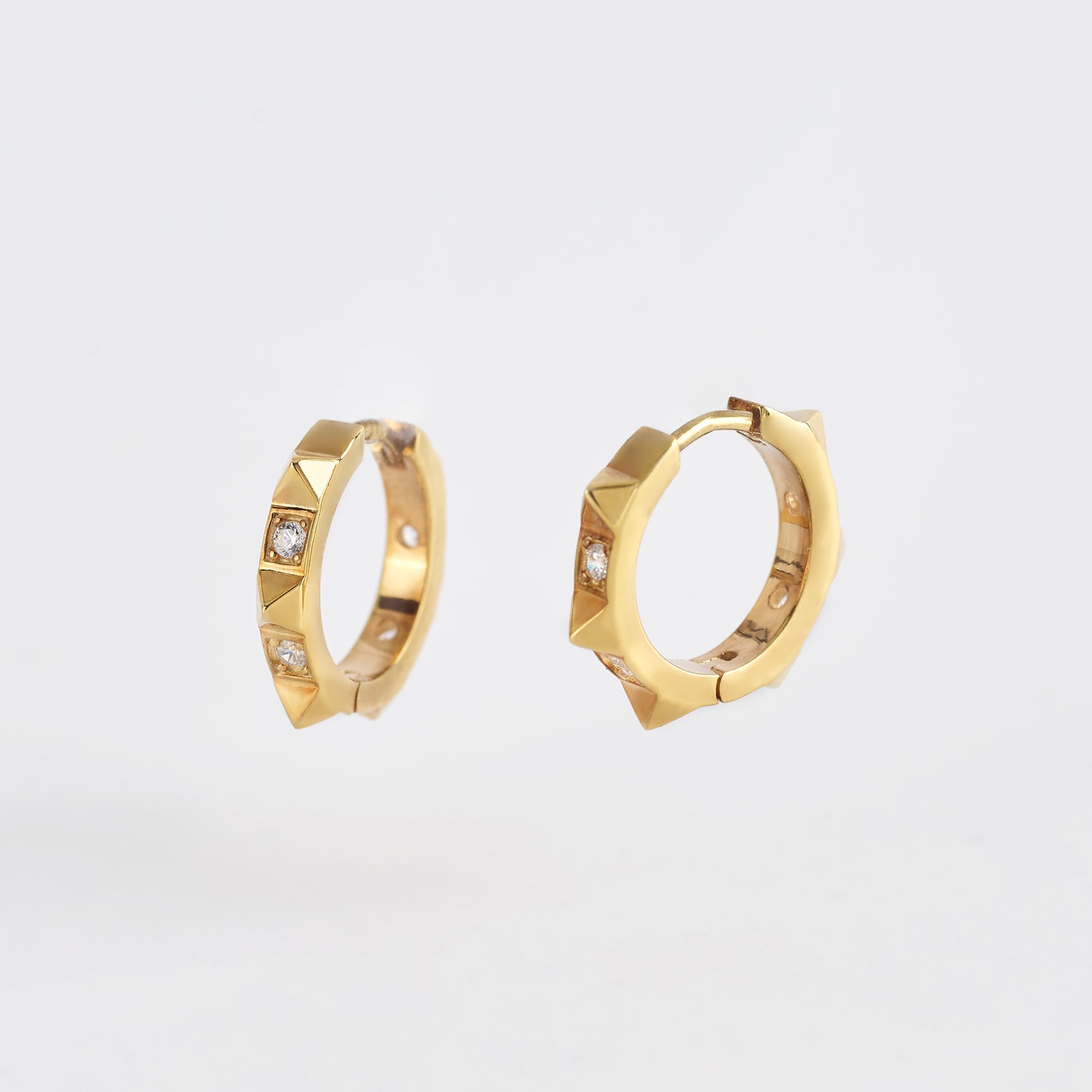 Orecchini a cerchio in argento dorato con borchie e zirconi.