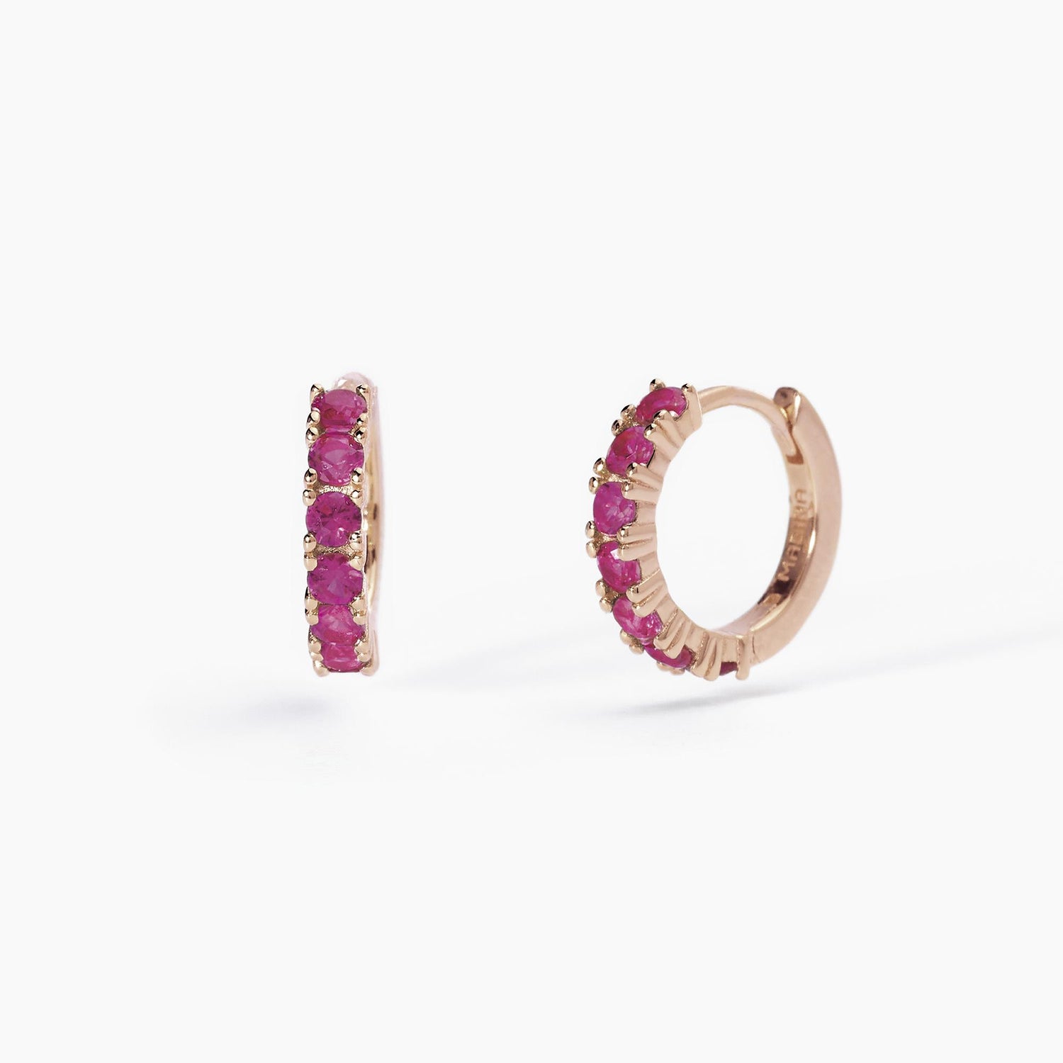 Orecchini da donna a cerchio in argento rosato con rubini sintetici.