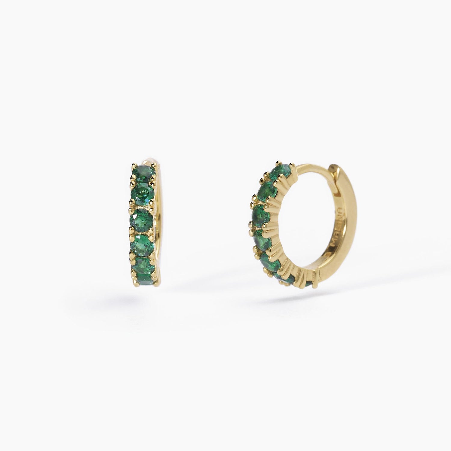 Orecchini da donna a cerchio in argento placcato oro 18k con smeraldi sintetici.