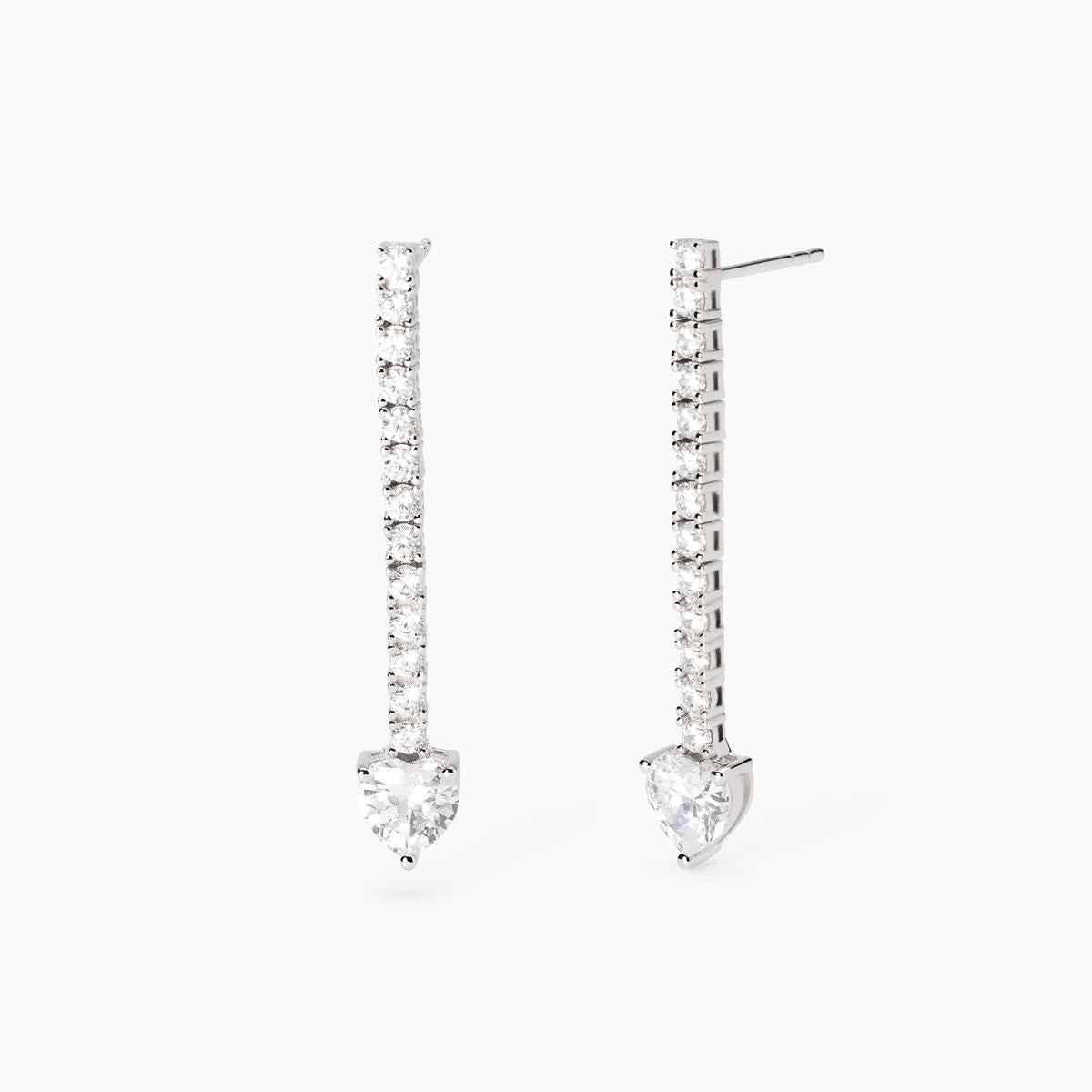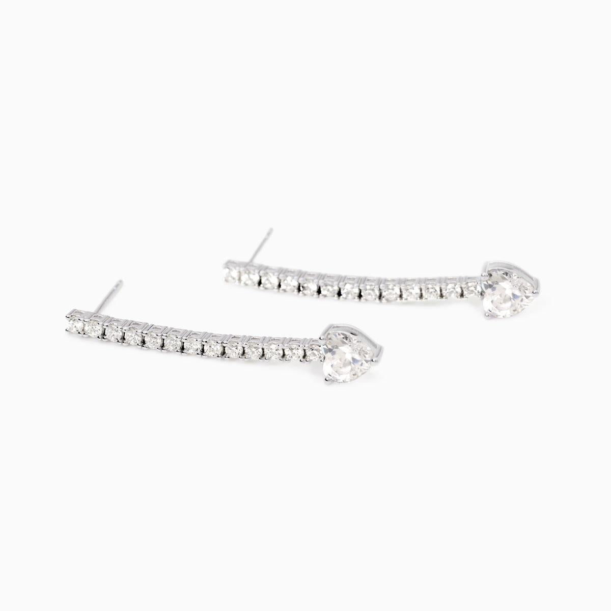Orecchini tennis pendenti da donna in argento rodiato con zirconi taglio cuore.