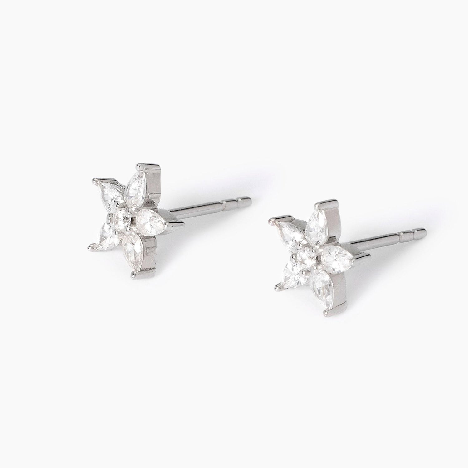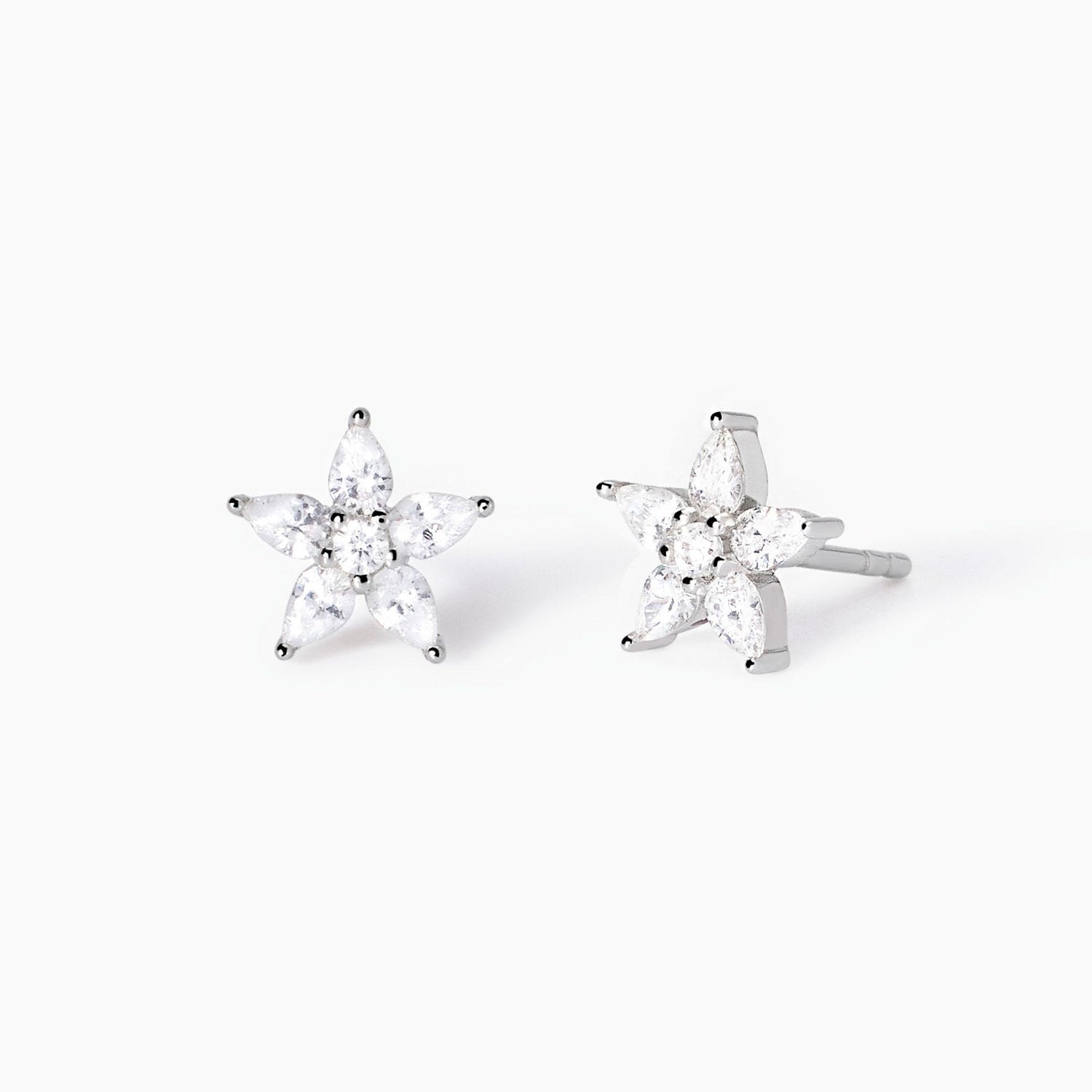 Orecchini da donna in argento rodiato a forma di fiore con zirconi taglio goccia.