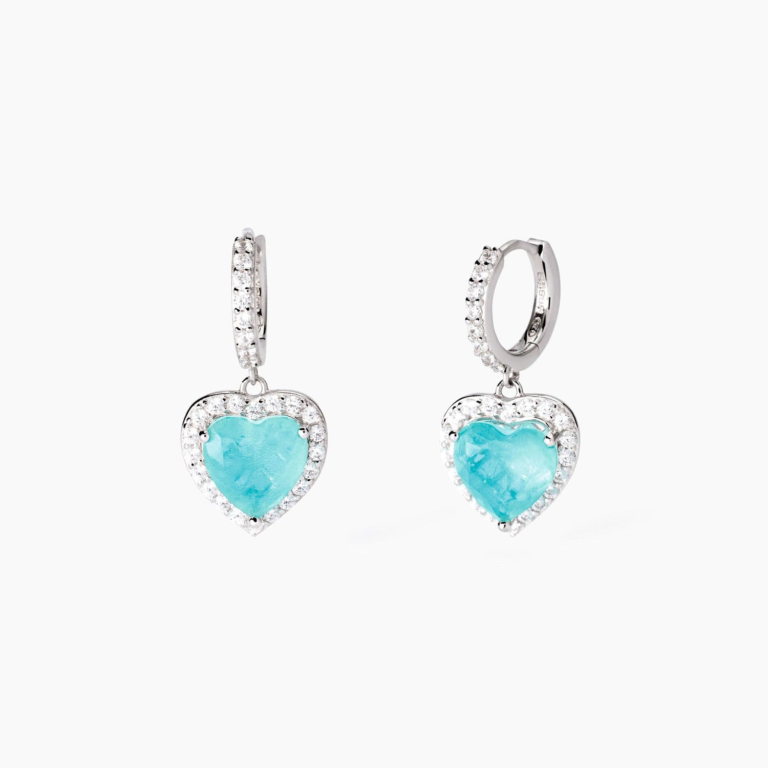 Orecchini da donna in argento rodiato a cerchio con zirconi e con pendenti a forma di cuore in glass azzurro, cristallo di rocca e zirconi.