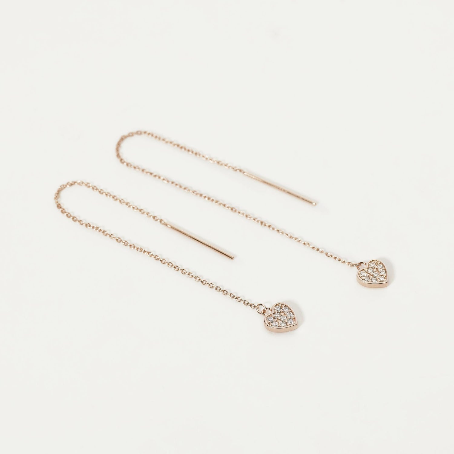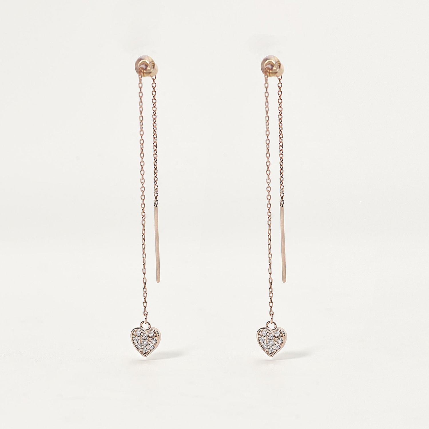 Orecchini in argento 925/°°° rosato, catena rolò larghezza 1.10 mm, lunghezza 7.50 cm, ciondolo cuore con zirconi bianchi Ø 1.25 mm.