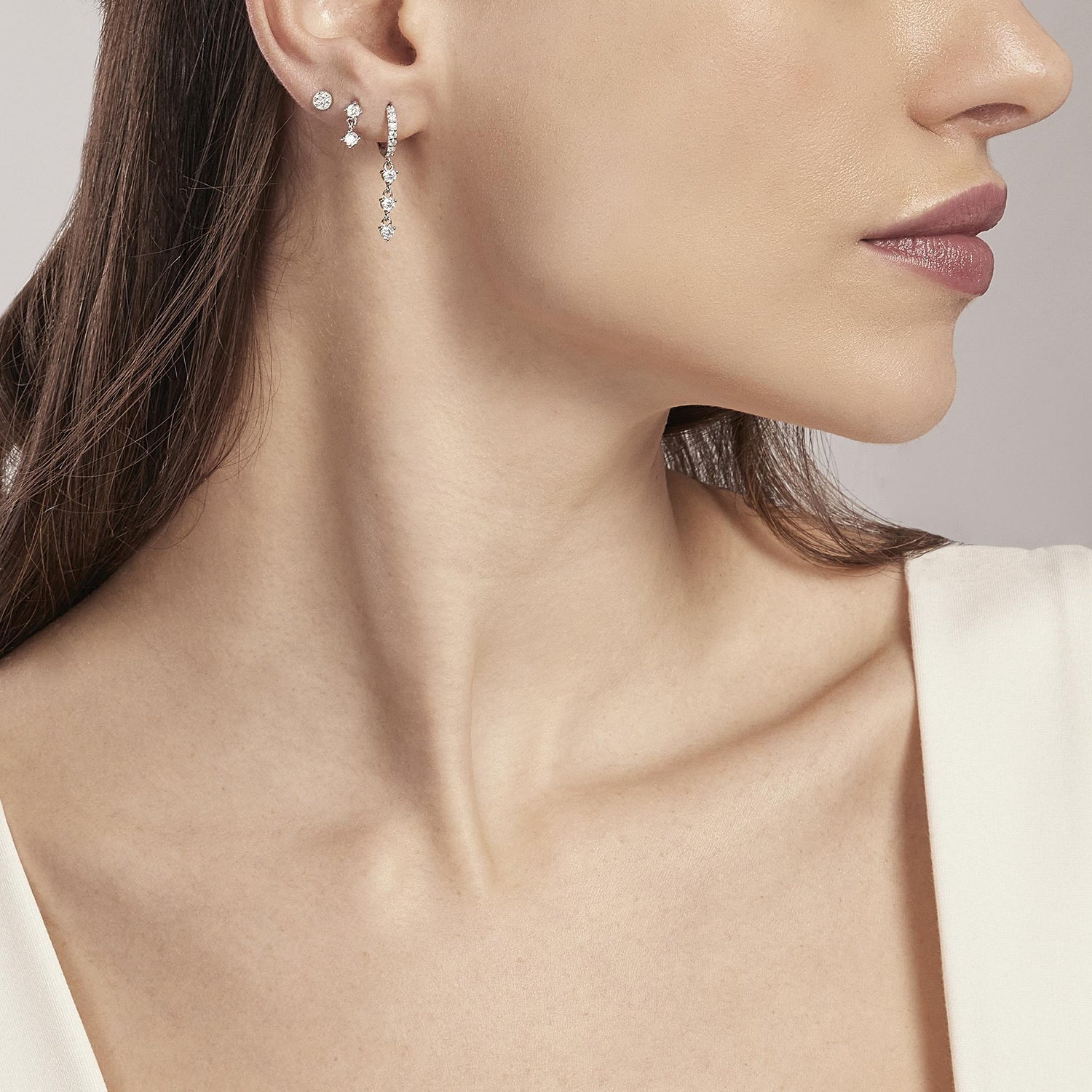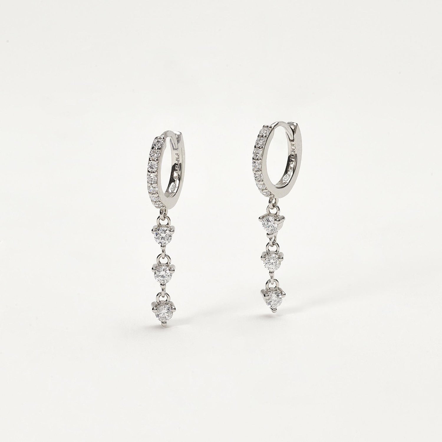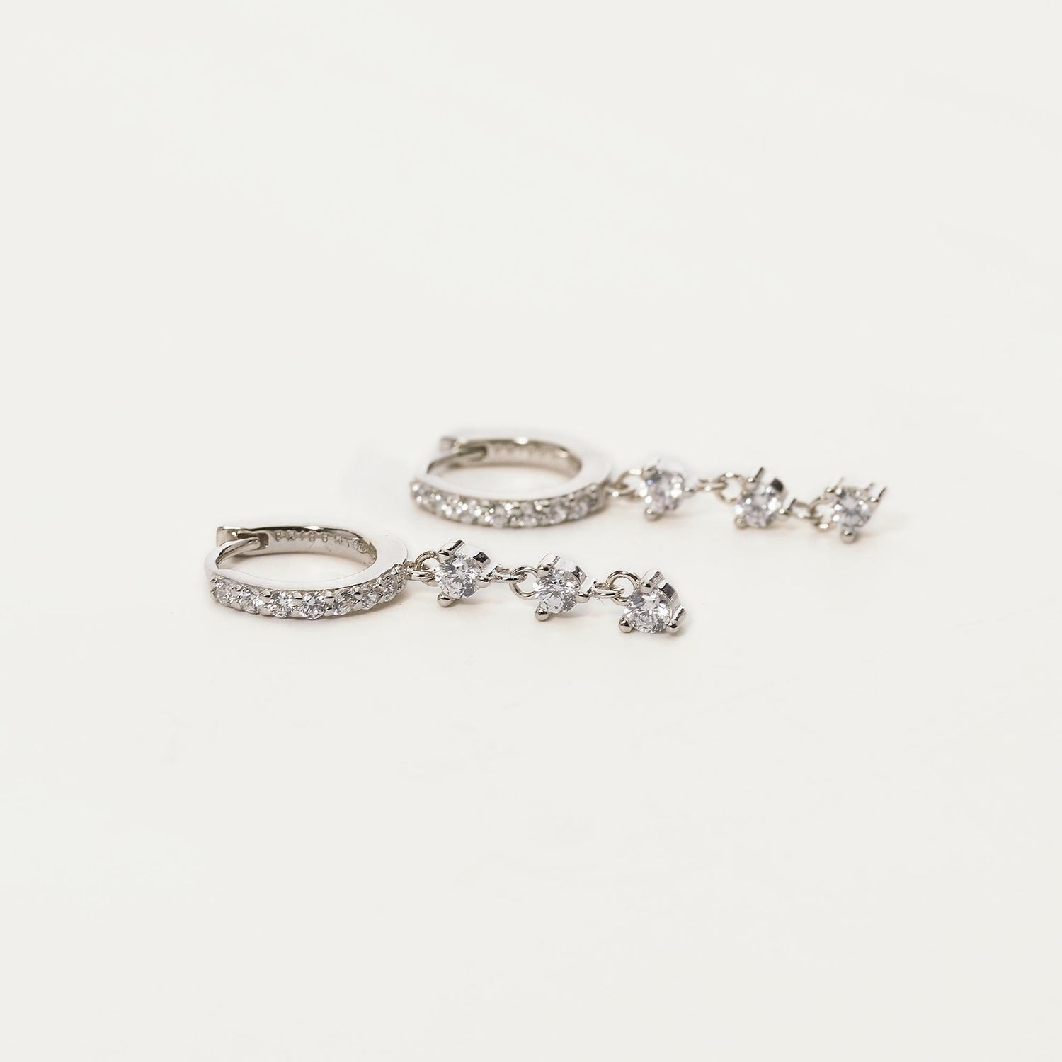 Orecchini in argento 925/°°° rodiato a cerchio con Ø esterno 11.90 mm e zirconi bianchi Ø 1.50 mm con 3 castoni a 3 griffe e zirconi bianchi Ø 2.50 mm.