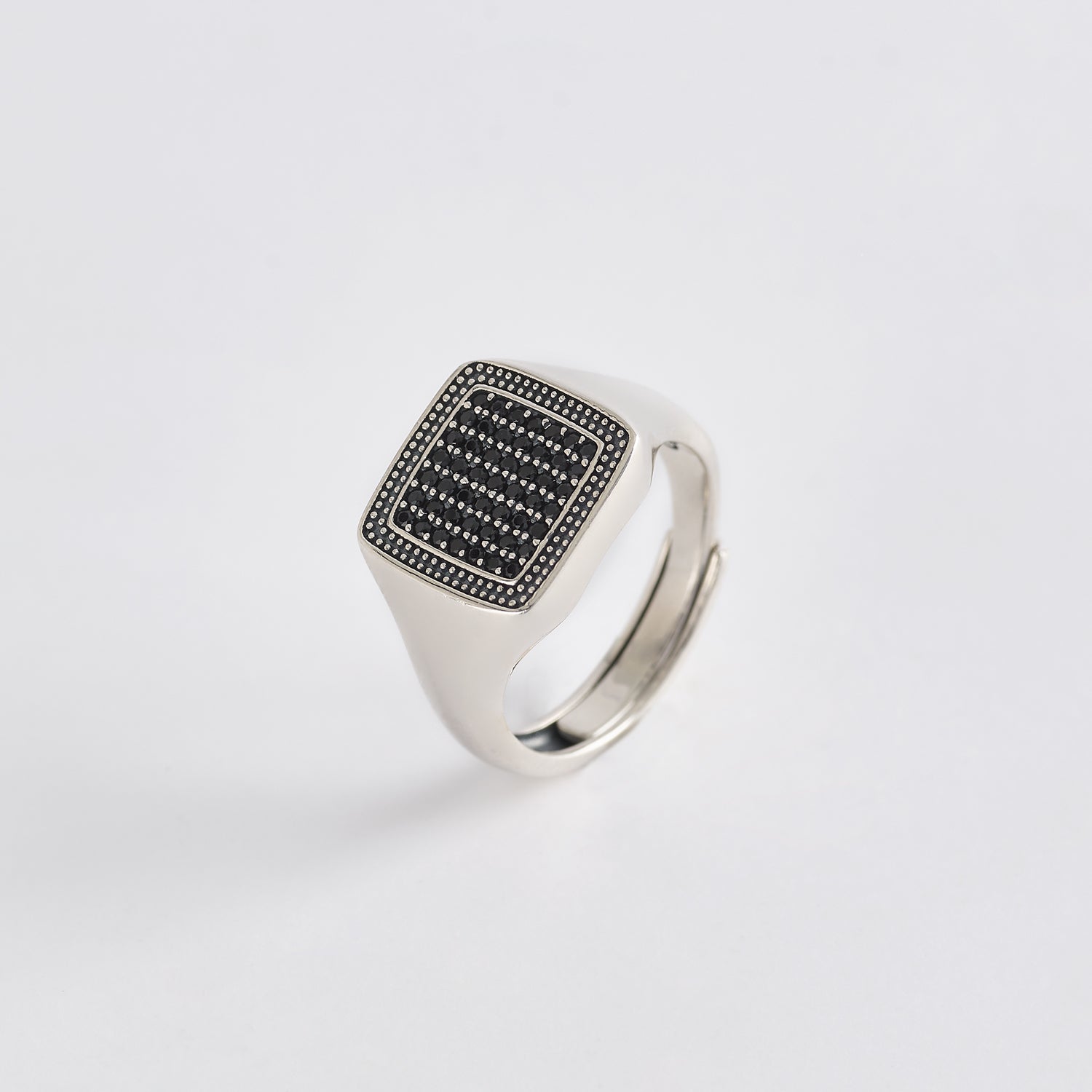 Anello chevalier borchiato in argento brunito con pavé in zirconi neri.