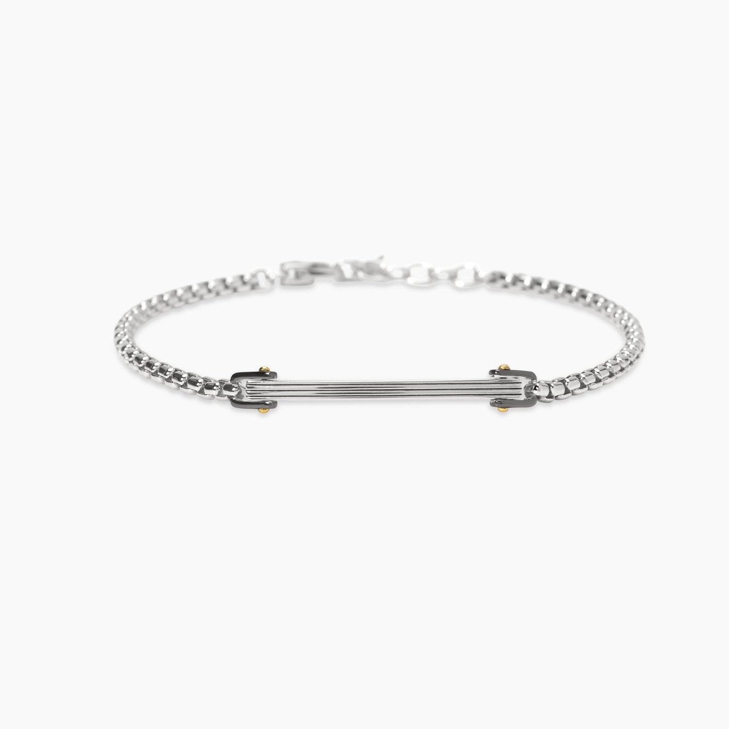 Bracciale uomo regolabile in argento rodiato con catena veneta e piastra centrale in argento lucido e brunito con viti placcate oro 18K.