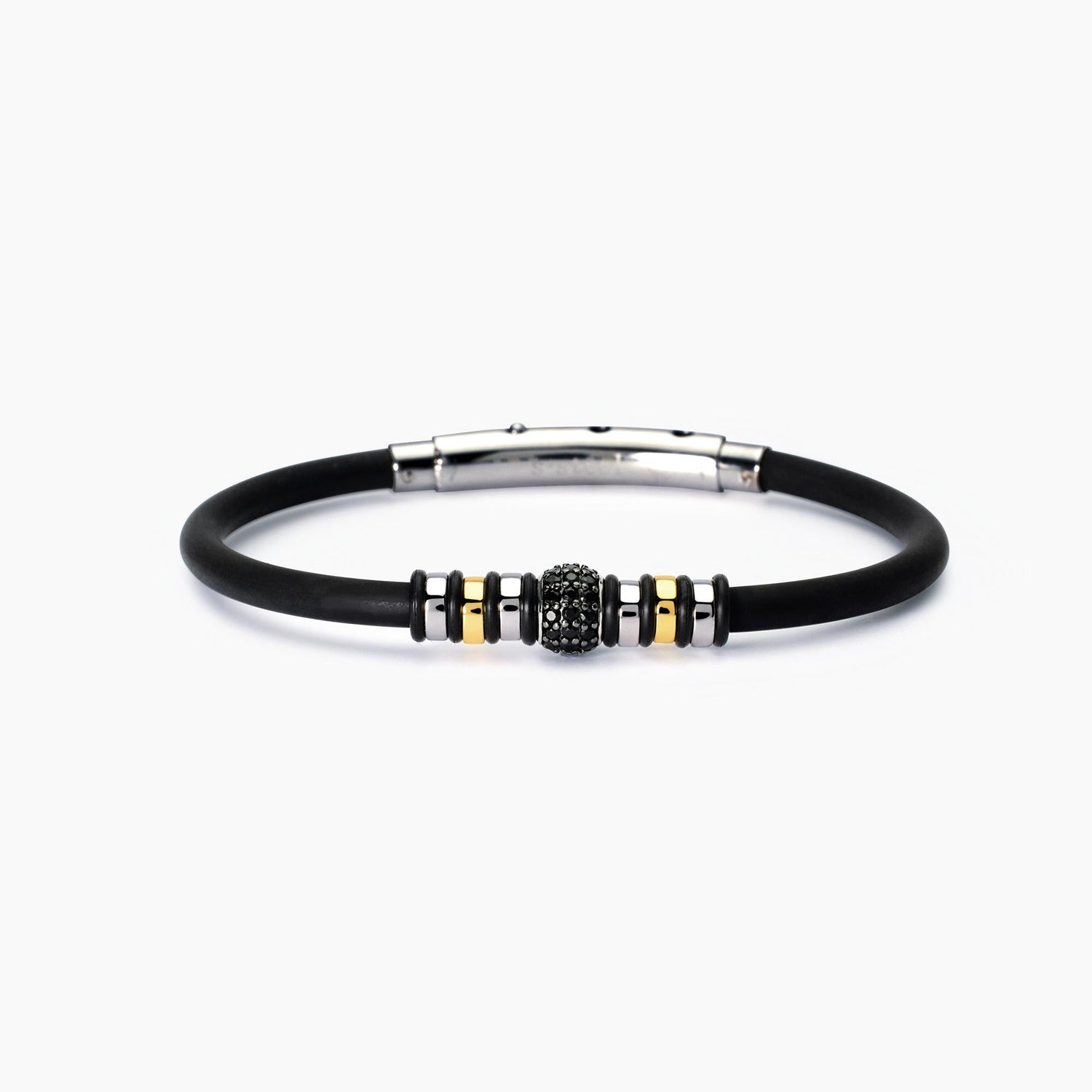 Bracciale regolabile da uomo in argento rodiato con silicone nero, elemento centrale con zirconi neri ed elementi in argento lucido e placcato oro.