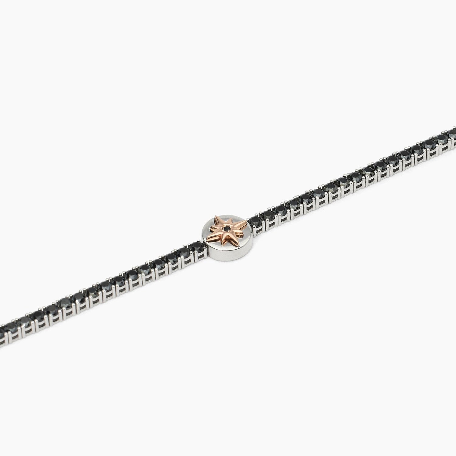 Bracciale da uomo modello tennis in argento rodiato con rosa dei venti placcata oro rosa 18k.