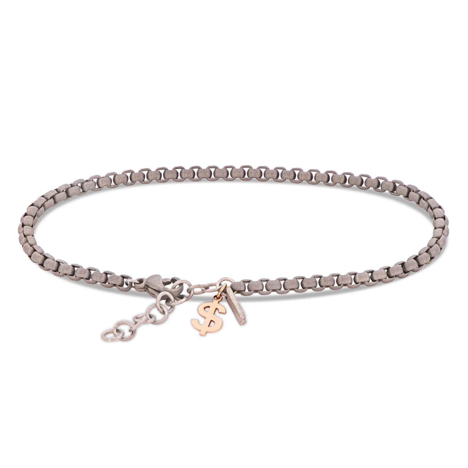 Un gioiello essenziale e maschile, perfetto per chi cerca un accessorio discreto ma di grande impatto. La catenina Scoobydoo in titanio, resistente e leggera, è impreziosita da un delicato charm in oro rosso a forma di quadrifoglio, o di ferro di cavallo, o di cornetto o di dollaro. Il tocco finale è dato dalla targhetta con logo e brillante black, firma inconfondibile di MANO|J. Realizzato a mano nei nostri laboratori italiani, questo bracciale è un pezzo unico artigianale.