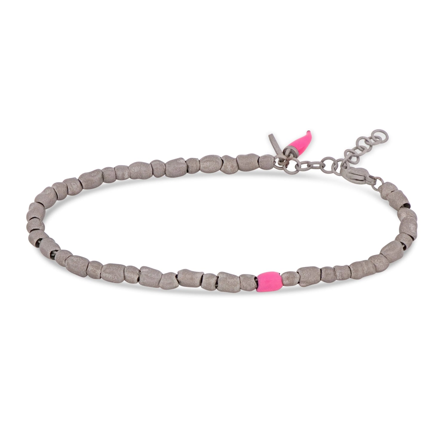 Un gioiello artigianale creato a mano nei nostri laboratori in Italia, realizzato in titanio leggero e resistente. Presenta una catena rolò morbida e scorrevole che ospita piccoli sassi in titanio. Un tocco di colore è dato dallo smalto rosso, o fucsia, o bianco, o azzurro, o verde o nero che decora uno dei sassi, mentre un piccolo cornetto smaltato dello stesso colore aggiunge un dettaglio finale raffinato. Il testimonial del marchio MANO|J., il brillante black da un punto, è incastonato sulla targhetta in titanio pendente vicino alla chiusura con moschettone.