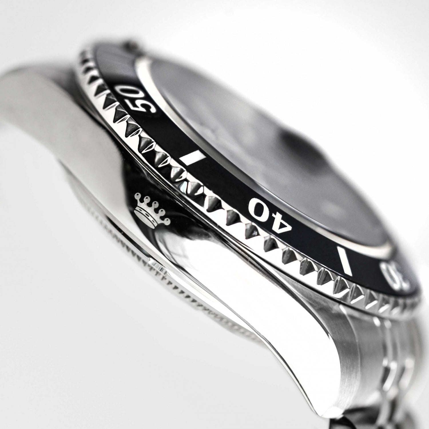 Acciaio diametro 42 mm, water resistant 10 ATM, corona serrata a vite, crystal coated sapphire, fondello acciaio con oblò a vista serrato a vite, Lunetta in ceramica, ghiera girevole unidirezionale 120 scatti, spessore della cassa mm 12,00