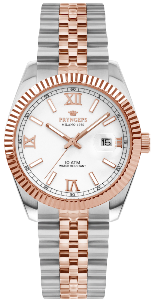 Bianco, cifre romane con indici in rilievo, indici applicati, logo in rilievo, datario al 3, solo tempo