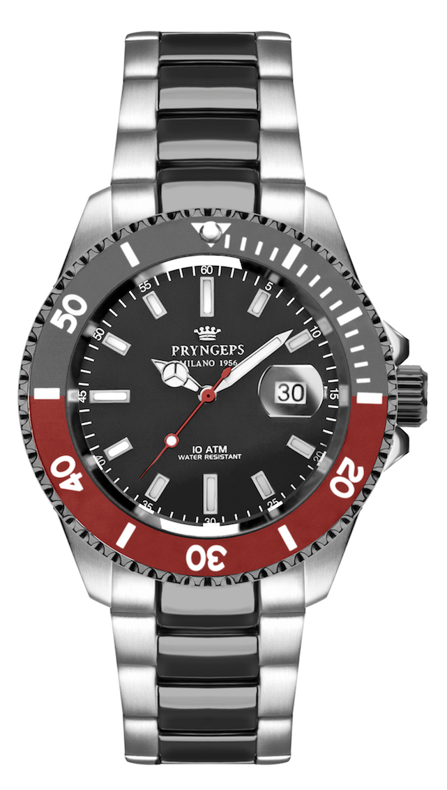 Acciaio diametro 42 mm, water resistant 10 ATM, corona serrata a vite personalizzata, crystal coated sapphire, fondello acciaio serrato a vite, ghiera girevole unidirezionale 120 scatti